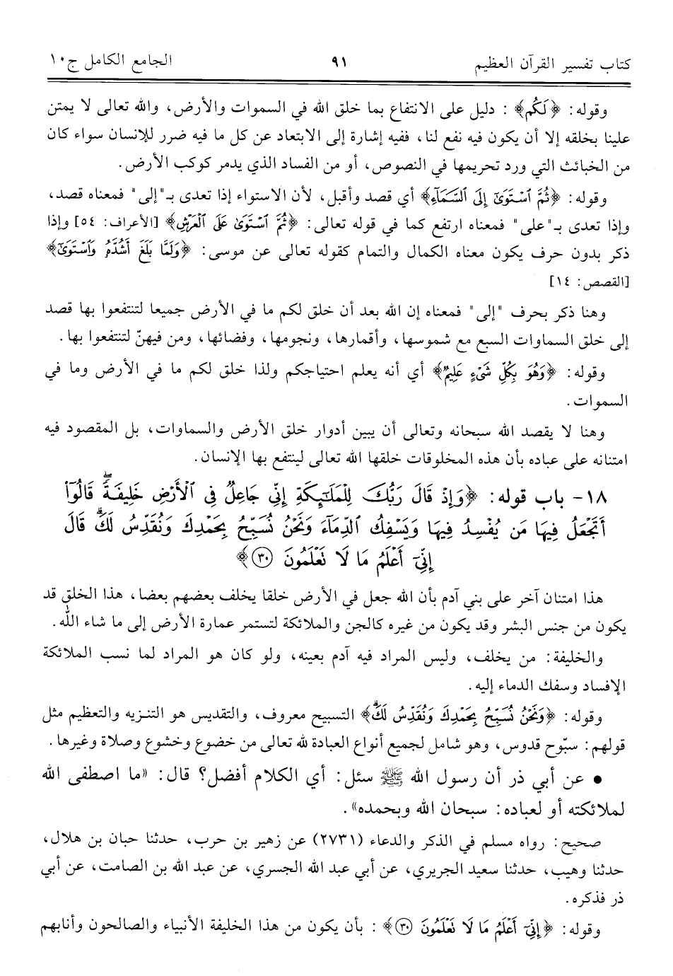 ١٨ - باب قوله: {وَإِذْ قَالَ رَبُّكَ لِلْمَلَائِكَةِ إِنِّي جَاعِلٌ فِي الْأَرْضِ خَلِيفَةً قَالُوا أَتَجْعَلُ فِيهَا مَنْ يُفْسِدُ فِيهَا وَيَسْفِكُ الدِّمَاءَ وَنَحْنُ نُسَبِّحُ بِحَمْدِكَ وَنُقَدِّسُ لَكَ قَالَ إِنِّي أَعْلَمُ مَا لَا تَعْلَمُونَ (٣٠)}