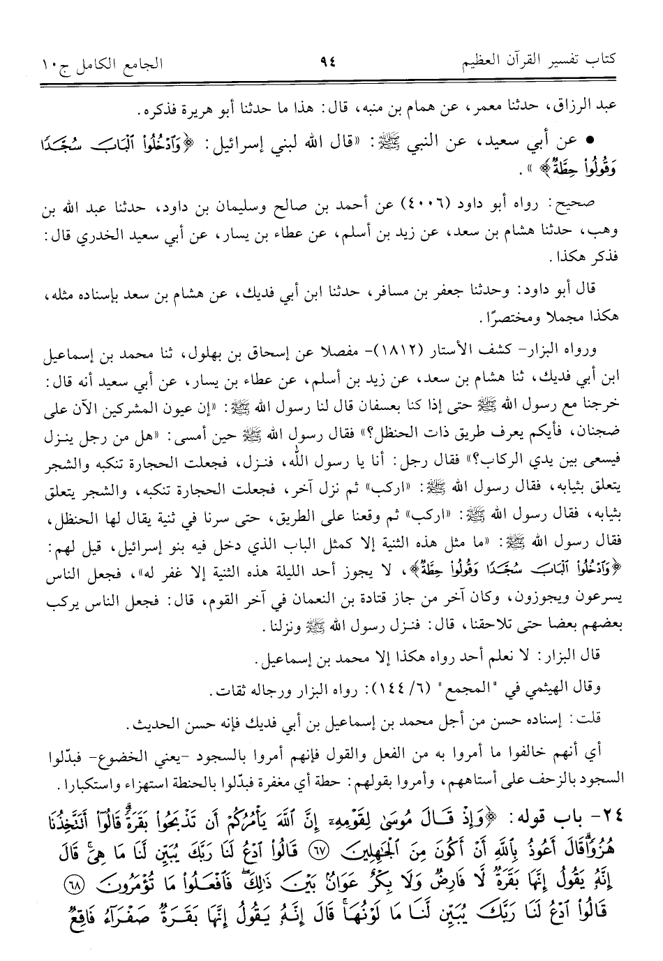 • عن أبي سعيد، عن النبي -صلى اللَّه عليه وسلم-: "قال اللَّه لبني إسرائيل: {وَادْخُلُوا الْبَابَ سُجَّدًا وَقُولُوا حِطَّةٌ} ".