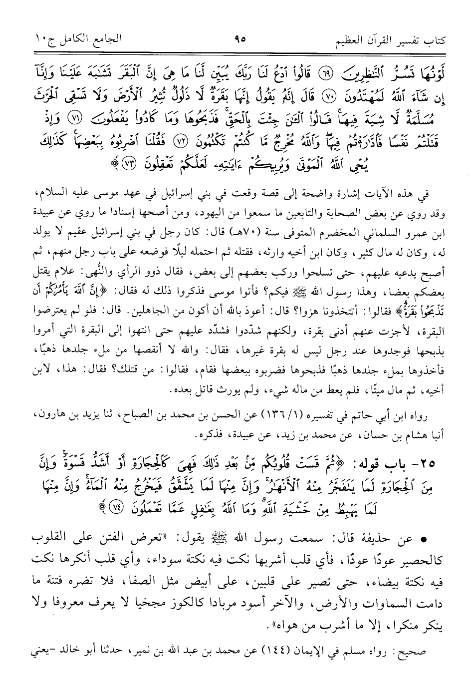في هذه الآيات إشارة واضحة إلى قصة وقعت في بني إسرائيل في عهد موسى عليه السلام، وقد روي عن بعض الصحابة والتابعين ما سمعوا من اليهود، ومن أصحها إسنادا ما روي عن عبيدة ابن عمرو السلماني المخضرم المتوفى سنة (٧٠ هـ) قال: كان رجل في بني إسرائيل عقيم لا يولد له، وكان له مال كثير، وكان ابن أخيه وارثه، فقتله ثم احتمله ليلًا فوضعه على باب رجل منهم، ثم أصبح يدعيه عليهم، حتى تسلحوا وركب بعضهم إلى بعض، فقال ذوو الرأي والنُّهى: علام يقتل بعضكم بعضًا، وهذا رسول اللَّه -صلى اللَّه عليه وسلم- فيكم؟ فأتوا موسى فذكروا ذلك له فقال: {إِنَّ اللَّهَ يَأْمُرُكُمْ أَنْ تَذْبَحُوا بَقَرَةً} فقالوا: أتتخذونا هزوا؟ قال: أعوذ باللَّه أن أكون من الجاهلين. قال: فلو لم يعترضوا البقرة، لأجزت عنهم أدنى بقرة، ولكنهم شدّدوا فشدّد عليهم حتى انتهوا إلى البقرة التي أمروا بذبحها فوجدوها عند رجل ليس له بقرة غيرها، فقال: واللَّه لا أنقصها من ملء جلدها ذهبًا، فأخذوها بملء جلدها ذهبًا فذبحوها فضربوه ببعضها فقام، فقالوا: من قتلك؟ فقال: هذا، لابن أخيه، ثم مال ميتًا، فلم يعط من ماله شيء، ولم يورث قاتل بعده.