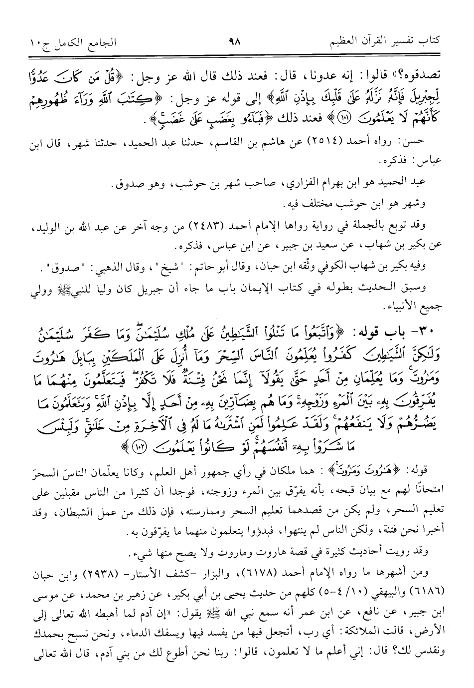 ٣٠ - باب قوله: {وَاتَّبَعُوا مَا تَتْلُو الشَّيَاطِينُ عَلَى مُلْكِ سُلَيْمَانَ وَمَا كَفَرَ سُلَيْمَانُ وَلَكِنَّ الشَّيَاطِينَ كَفَرُوا يُعَلِّمُونَ النَّاسَ السِّحْرَ وَمَا أُنْزِلَ عَلَى الْمَلَكَيْنِ بِبَابِلَ هَارُوتَ وَمَارُوتَ وَمَا يُعَلِّمَانِ مِنْ أَحَدٍ حَتَّى يَقُولَا إِنَّمَا نَحْنُ فِتْنَةٌ فَلَا تَكْفُرْ فَيَتَعَلَّمُونَ مِنْهُمَا مَا يُفَرِّقُونَ بِهِ بَيْنَ الْمَرْءِ وَزَوْجِهِ وَمَا هُمْ بِضَارِّينَ بِهِ مِنْ أَحَدٍ إِلَّا بِإِذْنِ اللَّهِ وَيَتَعَلَّمُونَ مَا يَضُرُّهُمْ وَلَا يَنْفَعُهُمْ وَلَقَدْ عَلِمُوا لَمَنِ اشْتَرَاهُ مَا لَهُ فِي الْآخِرَةِ مِنْ خَلَاقٍ وَلَبِئْسَ مَا شَرَوْا بِهِ أَنْفُسَهُمْ لَوْ كَانُوا يَعْلَمُونَ (١٠٢)}
