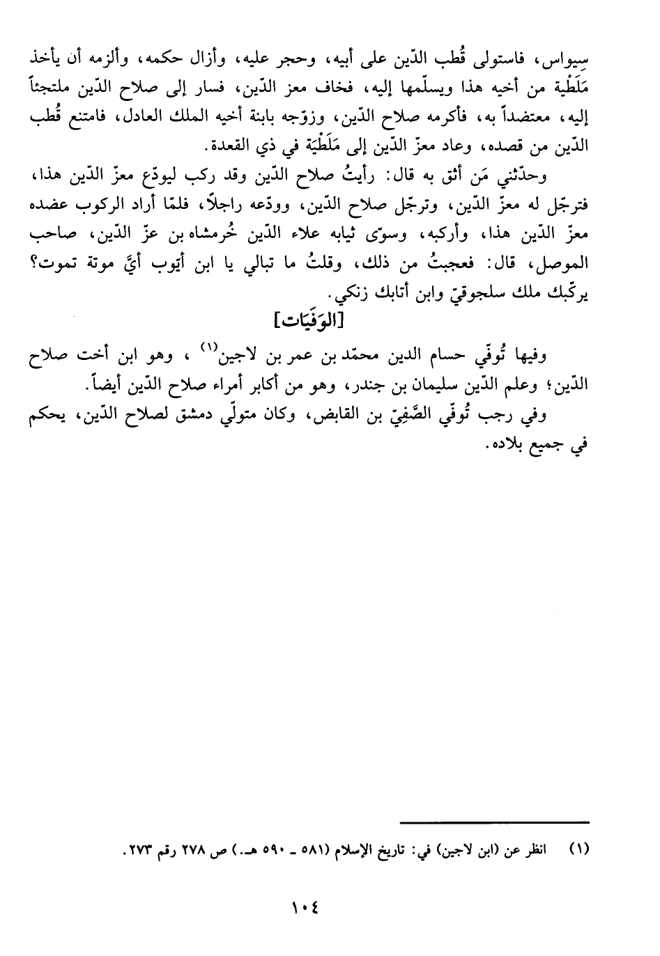 [الْوَفَيَاتُ] وَفِيهَا تُوُفِّيَ حُسَامُ الدِّينِ مُحَمَّدُ بْنُ عُمَرَ بْنِ لَاجِينَ، وَهُوَ ابْنُ أُخْتِ صَلَاحِ الدِّينِ، وَعَلَمُ الدِّينِ سُلَيْمَانُ بْنُ جُنْدُرْ، وَهُوَ مِنْ أَكَابِرِ أُمَرَاءِ صَلَاحِ الدِّينِ أَيْضًا.