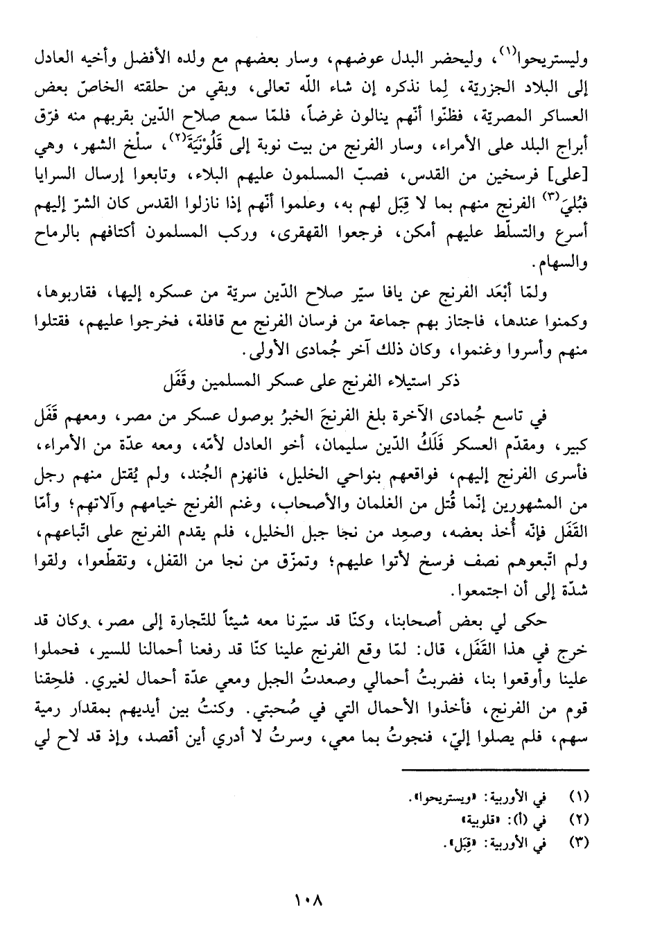 فَلَحِقَنَا قَوْمٌ مِنَ الْفِرِنْجِ، فَأَخَذُوا الْأَحْمَالَ الَّتِي فِي صُحْبَتِي، وَكُنْتُ بَيْنَ أَيْدِيهِمْ بِمِقْدَارِ رَمْيَةِ سَهْمٍ، فَلَمْ يَصِلُوا إِلَيَّ، فَنَجَوْتُ بِمَا مَعِي، وَسِرْتُ لَا أَدْرِي أَيْنَ أَقْصِدُ، وَإِذْ قَدْ لَاحَ لِي