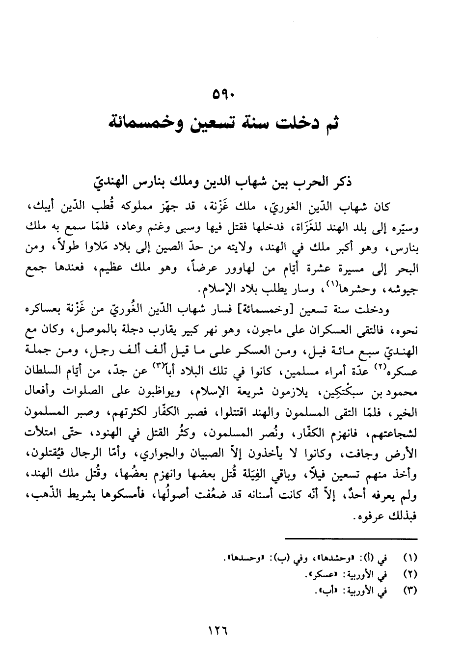 وَدَخَلَتْ سَنَةُ تِسْعِينَ [وَخَمْسِمِائَةٍ] ، فَسَارَ شِهَابُ الدِّينِ الْغُورِيُّ، مِنْ غَزْنَةَ بِعَسَاكِرِهِ نَحْوَهُ، فَالْتَقَى الْعَسْكَرَانِ عَلَى مَاجُونَ، وَهُوَ نَهَرٌ كَبِيرٌ يُقَارِبُ دِجْلَةَ بِالْمَوْصِلِ، وَكَانَ مَعَ الْهِنْدِيِّ سَبْعُمِائَةِ فِيلٍ، وَمِنَ الْعَسْكَرِ عَلَى مَا قِيلَ أَلْفُ أَلْفِ رَجُلٍ، وَمِنْ جُمْلَةِ عَسْكَرِهِ عِدَّةُ أُمَرَاءَ مُسْلِمِينَ، وَكَانُوا فِي تِلْكَ الْبِلَادِ أَبًّا عَنْ جَدٍّ، مِنْ أَيَّامِ السُّلْطَانِ مَحْمُودِ بْنِ سُبُكْتِكِينَ، يُلَازِمُونَ شَرِيعَةَ الْإِسْلَامِ، وَيُوَاظِبُونَ عَلَى الصَّلَوَاتِ، وَأَفْعَالِ الْخَيْرِ. فَلَمَّا الْتَقَى الْمُسْلِمُونَ وَالْهُنُودُ اقْتَتَلُوا، فَصَبَرَ الْكُفَّارُ لِكَثْرَتِهِمْ، وَصَبَرَ الْمُسْلِمُونَ لِشَجَاعَتِهِمْ، فَانْهَزَمَ الْكُفَّارُ، وَنُصِرَ الْمُسْلِمُونَ، وَكَثُرَ الْقَتْلُ فِي الْهُنُودِ، حَتَّى امْتَلَأَتِ الْأَرْضُ وَجَافَتْ.