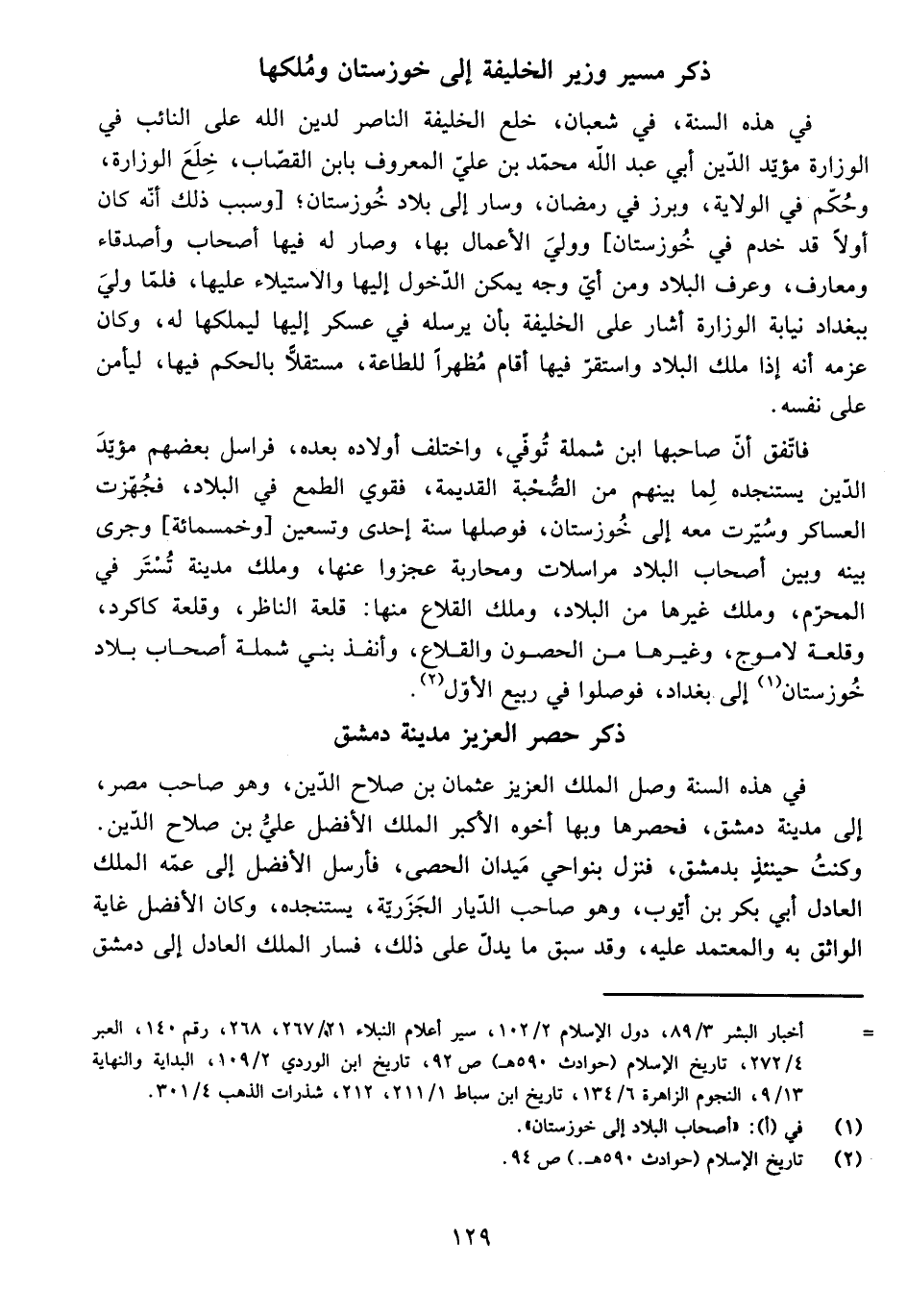 ذِكْرُ مَسِيرِ وَزِيرِ الْخَلِيفَةِ إِلَى خُوزِسْتَانَ وَمُلْكِهَا فِي هَذِهِ السَّنَةِ، فِي شَعْبَانَ، خَلَعَ الْخَلِيفَةُ النَّاصِرُ لِدِينِ اللَّهِ عَلَى النَّائِبِ فِي الْوِزَارَةِ مُؤَيِّدِ الدِّينِ أَبِي عَبْدِ اللَّهِ مُحَمَّدِ بْنِ عَلِيٍّ الْمَعْرُوفِ بِابْنِ الْقَصَّابِ، خِلَعَ الْوِزَارَةِ، وَحُكِّمَ فِي الْوِلَايَةِ وَبَرَزَ فِي رَمَضَانَ، وَسَارَ إِلَى بِلَادِ خُوزِسْتَانَ ; [وَسَبَبُ ذَلِكَ أَنَّهُ كَانَ أَوَّلًا قَدْ خَدَمَ فِي خُوزِسْتَانَ] ، وَوَلِيَ الْأَعْمَالَ بِهَا، وَصَارَ لَهُ فِيهَا أَصْحَابٌ وَأَصْدِقَاءُ وَمَعَارِفُ، وَعَرَفَ الْبِلَادَ وَمِنْ أَيِّ وَجْهٍ يُمْكِنُ الدُّخُولُ إِلَيْهَا وَالِاسْتِيلَاءُ عَلَيْهَا، فَلَمَّا وَلِيَ بِبَغْدَادَ نِيَابَةَ الْوِزَارَةِ أَشَارَ عَلَى الْخَلِيفَةِ بِأَنْ يُرْسِلَهُ فِي عَسْكَرٍ إِلَيْهَا لِيَمْلِكَهَا لَهُ، وَكَانَ عَزْمُهُ أَنَّهُ إِذَا مَلَكَ الْبِلَادَ وَاسْتَقَرَّ فِيهَا أَقَامَ مُظْهِرًا لِلطَّاعَةِ، مُسْتَقِلًّا بِالْحُكْمِ فِيهَا; لِيَأْمَنَ عَلَى نَفْسِهِ.