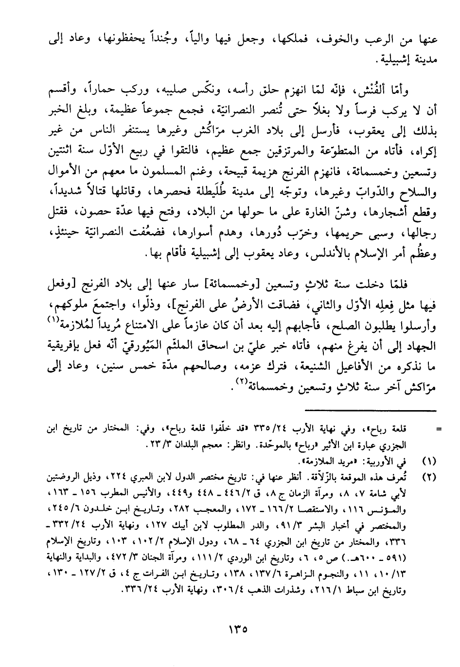 فَلَمَّا دَخَلَتْ سَنَةُ ثَلَاثٍ وَتِسْعِينَ [وَخَمْسِمِائَةٍ] ، سَارَ عَنْهَا إِلَى بِلَادِ الْفِرِنْجِ [وَفَعَلَ فِيهَا مِثْلَ فِعْلِهِ الْأَوَّلِ وَالثَّانِي، فَضَاقَتِ الْأَرْضُ عَلَى الْفِرِنْجِ] ، وَذُلُّوا وَاجْتَمَعَ مُلُوكُهُمْ، وَأَرْسَلُوا يَطْلُبُونَ الصُّلْحَ، فَأَجَابَهُمْ إِلَيْهِ بَعْدَ أَنْ كَانَ عَازِمًا عَلَى الِامْتِنَاعِ، مُرِيدًا لِمُلَازَمَةِ الْجِهَادِ إِلَى أَنْ يَفْرُغَ مِنْهُمْ، فَأَتَاهُ خَبَرُ عَلِيِّ بْنِ إِسْحَاقَ الْمُلَثَّمِ الْمَيُورْقِيِّ أَنَّهُ فَعَلَ بِإِفْرِيقِيَّةَ مَا نَذْكُرُهُ مِنَ الْأَفَاعِيلِ الشَّنِيعَةِ، فَتَرَكَ عَزْمَهُ، وَصَالَحَهُمْ مُدَّةَ خَمْسِ سِنِينَ، وَعَادَ إِلَى مُرَّاكِشَ آخِرَ سَنَةِ ثَلَاثٍ وَتِسْعِينَ وَخَمْسِمِائَةٍ.