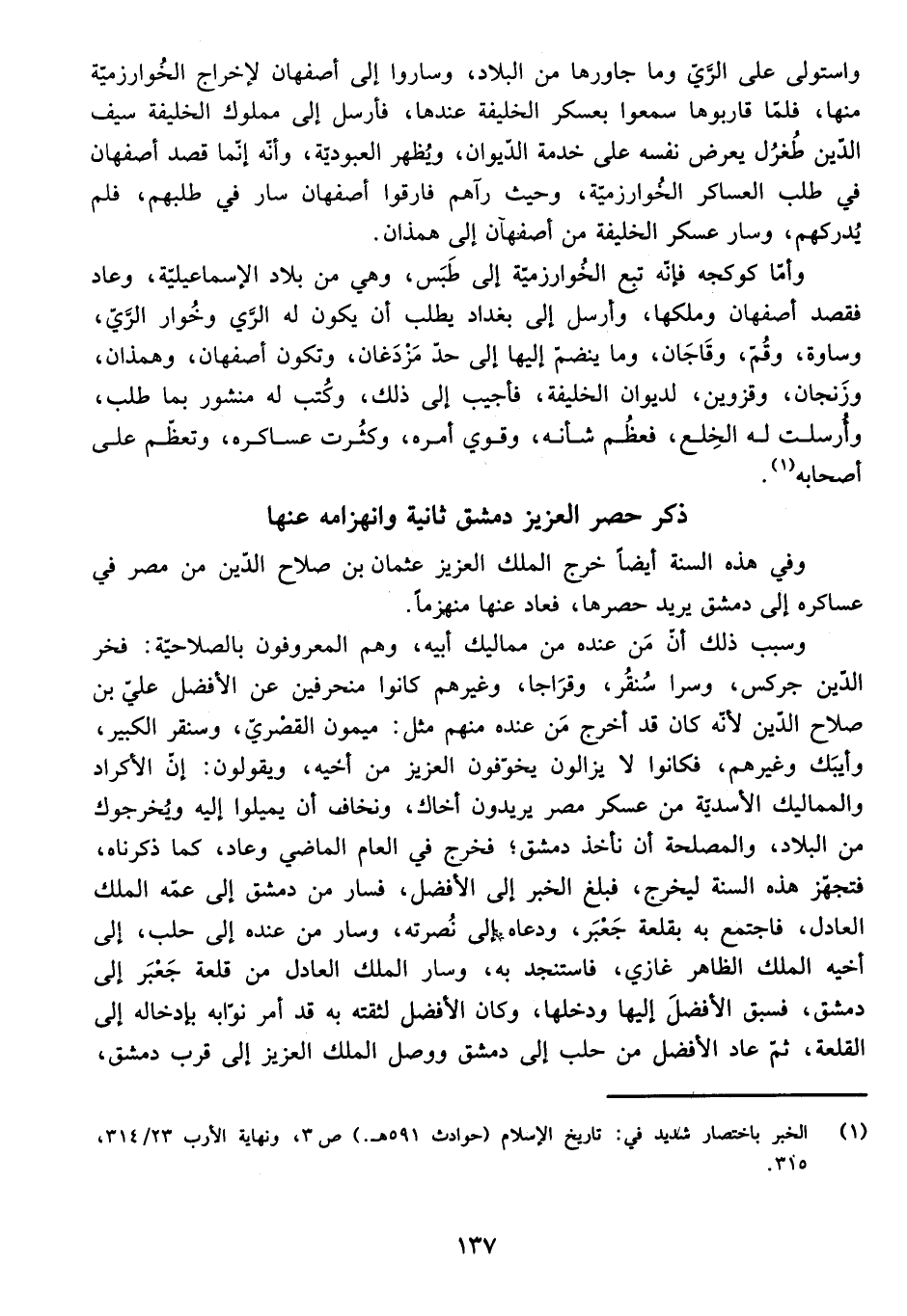 وَفِي هَذِهِ السَّنَةِ أَيْضًا رَجَعَ الْمَلِكُ الْعَزِيزُ عُثْمَانُ بْنُ صَلَاحِ الدِّينِ مِنْ مِصْرَ فِي عَسَاكِرِهِ إِلَى دِمَشْقَ يُرِيدُ حَصْرَهَا، فَعَادَ عَنْهَا مُنْهَزِمًا.