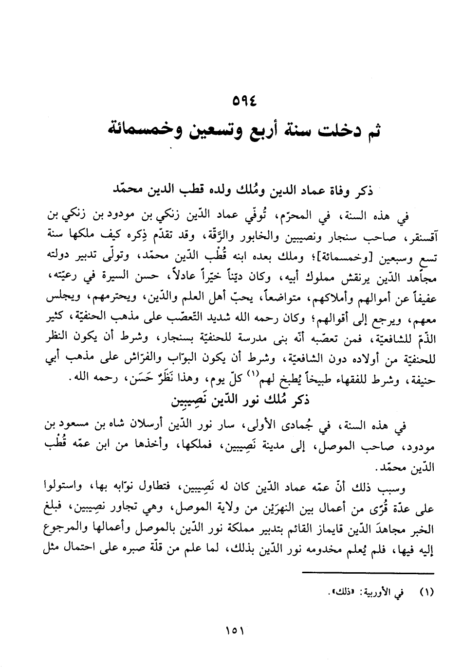 ذِكْرُ وَفَاةِ عِمَادِ الدِّينِ وَمُلْكِ وَلَدِهِ قُطْبِ الدِّينِ مُحَمَّدٍ فِي هَذِهِ السَّنَةِ، فِي الْمُحَرَّمِ، تُوُفِّيَ عِمَادُ الدِّينِ زِنْكِي بْنُ مَوْدُودِ بْنِ زِنْكِي بْنِ آقَسُنْقُرْ - صَاحِبُ سِنْجَارَ وَنَصِيبِينَ وَالْخَابُورِ وَالرِّقَّةِ - وَتَقَدَّمَ ذِكْرُهُ كَيْفَ مَلَكَهَا سَنَةَ تِسْعٍ وَسَبْعِينَ [وَخَمْسِمِائَةٍ] ، وَمَلَكَ بَعْدَهُ ابْنُهُ قُطْبُ الدِّينِ مُحَمَّدٌ، وَتَوَلَّى تَدْبِيرَ دَوْلَتِهِ مُجَاهِدُ الدِّينِ يَرَنْقَشْ مَمْلُوكُ أَبِيهِ، وَكَانَ دَيِّنًا خَيِّرًا عَادِلًا، حَسَنَ السِّيرَةِ فِي رَعِيَّتِهِ، عَفِيفًا عَنْ أَمْوَالِهِمْ وَأَمْلَاكِهِمْ، مُتَوَاضِعًا يُحِبُّ أَهْلَ الْعِلْمِ وَالدِّينِ وَيَحْتَرِمُهُمْ وَيَجْلِسُ مَعَهُمْ وَيَرْجِعُ إِلَى أَقْوَالِهِمْ، وَكَانَ رَحِمَهُ اللَّهُ شَدِيدَ التَّعَصُّبِ عَلَى مَذْهَبِ الْحَنَفِيَّةِ، كَثِيرَ الذَّمِّ لِلشَّافِعِيَّةِ، فَمِنْ تَعَصُّبِهِ أَنَّهُ بَنَى مَدْرَسَةً لِلْحَنَفِيَّةِ بِسِنْجَارَ، وَشَرَطَ أَنْ يَكُونَ النَّظَرُ لِلْحَنَفِيَّةِ مِنْ أَوْلَادِهِ دُونَ الشَّافِعِيَّةِ، وَشَرَطَ أَنْ يَكُونَ الْبَوَّابُ وَالْفَرَّاشُ عَلَى مَذْهَبِ أَبِي حَنِيفَةَ، وَشَرَطَ لِلْفُقَهَاءِ طَبِيخًا طُبِخَ لَهُمْ كُلَّ يَوْمٍ، وَهَذَا نَظَرٌ حَسَنٌ - رَحِمَهُ اللَّهُ.
