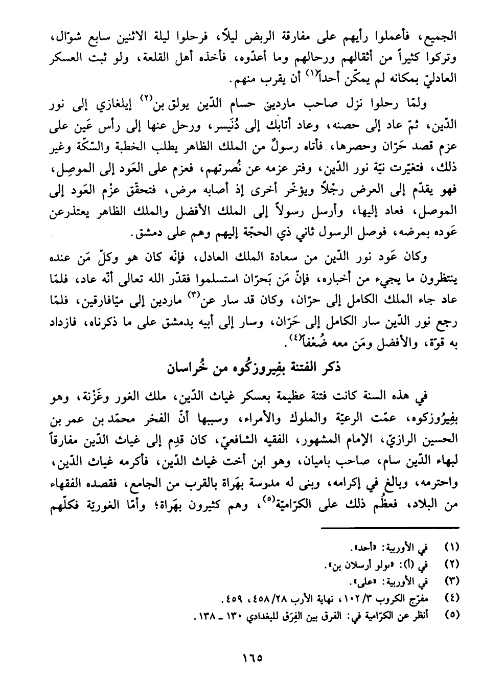 فِي هَذِهِ السَّنَةِ كَانَتْ فِتْنَةً عَظِيمَةً بِعَسْكَرِ غِيَاثِ الدِّينِ - مَلِكِ الْغَوْرِ وَغَزْنَةَ - وَهُوَ بِفَيْرُوزَكُوه، عَمَّتِ الرَّعِيَّةَ وَالْمُلُوكَ وَالْأُمَرَاءَ، وَسَبَبُهَا أَنَّ الْفَخْرَ مُحَمَّدَ بْنَ عُمَرَ بْنِ الْحُسَيْنِ الرَّازِيَّ، الْإِمَامَ الْمَشْهُورَ، الْفَقِيهَ الشَّافِعِيَّ، كَانَ قَدِمَ إِلَى غِيَاثِ الدِّينِ مُفَارِقًا لِبَهَاءِ الدِّينِ سَامَ، صَاحِبِ بَامِيَانَ، وَهُوَ ابْنُ أُخْتِ غِيَاثِ الدِّينِ، فَأَكْرَمَهُ غِيَاثُ الدِّينِ، وَاحْتَرَمَهُ، وَبَالَغَ فِي إِكْرَامِهِ، وَبَنَى لَهُ مَدْرَسَةً بِهَرَاةَ بِالْقُرْبِ مِنَ الْجَامِعِ، فَقَصَدَهُ الْفُقَهَاءُ مِنَ الْبِلَادِ، فَعَظُمَ ذَلِكَ عَلَى الْكَرَّامِيَّةِ، وَهُمْ كَثِيرُونَ بِهَرَاةَ، وَأَمَّا الْغُورِيَّةُ فَكُلُّهُمْ