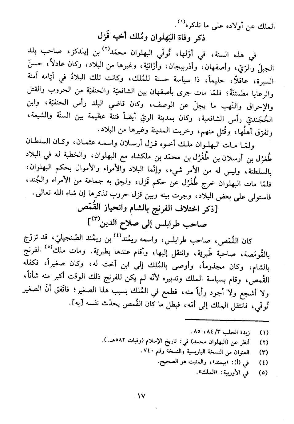 وَلَمَّا مَاتَ الْبَهْلَوَانُ مَلَكَ أَخُوهُ قُزَل أَرْسَلَانَ وَاسْمُهُ عُثْمَانُ، وَكَانَ السُّلْطَانُ طُغْرُلْ بْنُ أَرْسِلَانَ بْنِ طُغْرُلْ بْنِ مُحَمَّدِ بْنِ مَلِكْشَاهَ مَعَ الْبَهْلَوَانِ، وَالْخُطْبَةُ لَهُ فِي الْبِلَادِ بِالسَّلْطَنَةِ، وَلَيْسَ لَهُ مِنَ الْأَمْرِ شَيْءٌ، وَإِنَّمَا الْبِلَادُ وَالْأُمَرَاءُ وَالْأَمْوَالُ بِحُكْمِ الْبَهْلَوَانِ.