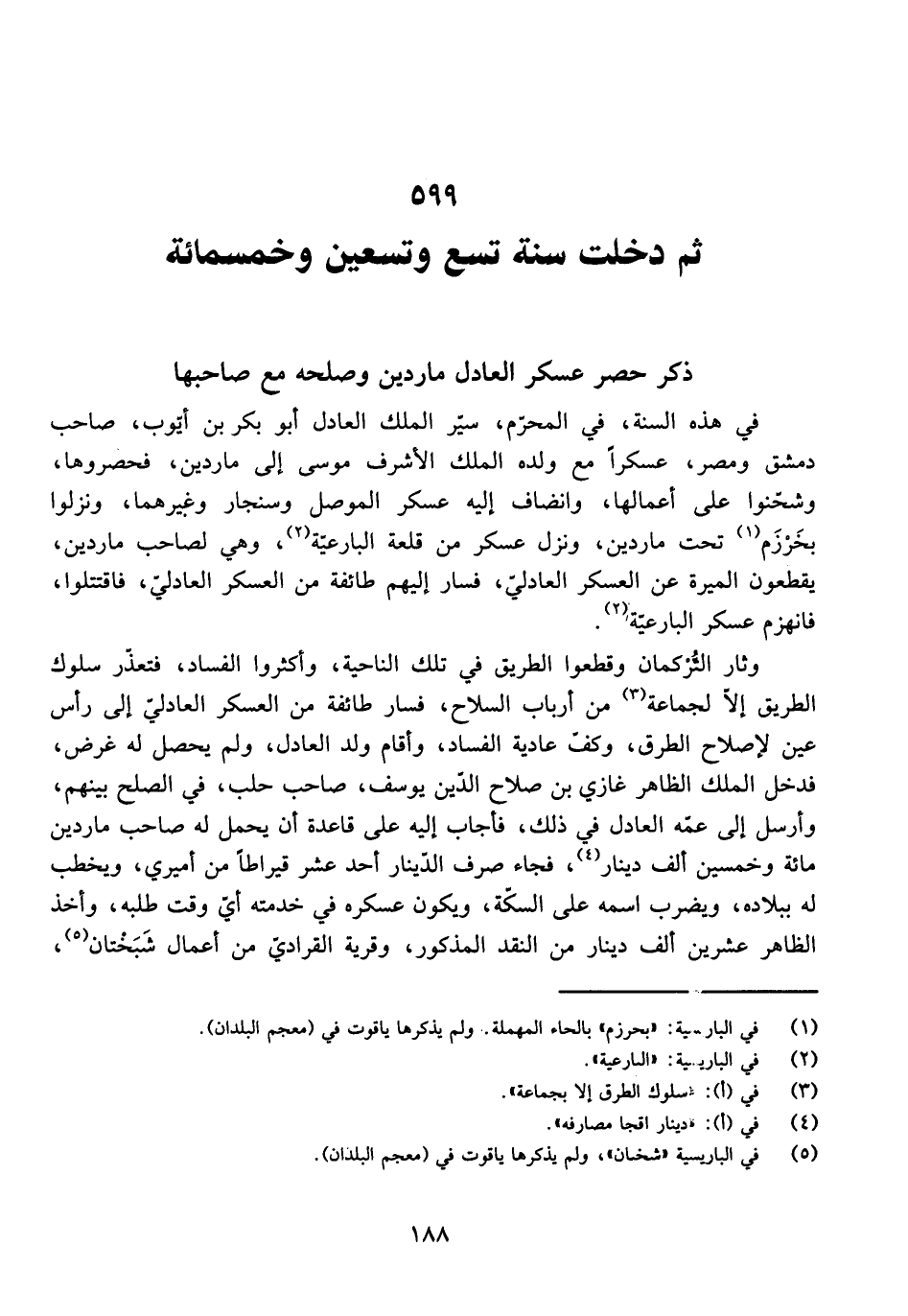 فِي هَذِهِ السَّنَةِ، فِي الْمُحَرَّمِ، سَيَّرَ الْمَلِكُ الْعَادِلُ أَبُو بَكْرِ بْنُ أَيُّوبَ صَاحِبُ دِمَشْقَ وَمِصْرَ، عَسْكَرًا مَعَ وَلَدِهِ الْمَلِكِ الْأَشْرَفِ مُوسَى إِلَى مَارْدِينَ، فَحَصَرُوهَا، وَشَحَنُوا عَلَى أَعْمَالِهَا، وَانْضَافَ إِلَيْهِ عَسْكَرُ الْمَوْصِلِ وَسِنْجَارَ وَغَيْرِهِمَا، وَنَزَلُوا بِخَرْزَمَ تَحْتَ مَارْدِينَ، وَنَزَلَ عَسْكَرٌ مِنْ قَلْعَةِ الْبَارِعِيِّةِ - وَهِيَ لِصَاحِبِ مَارْدِينَ - يَقْطَعُونَ الْمِيرَةَ عَنِ الْعَسْكَرِ الْعَادِلِيِّ، فَسَارَ إِلَيْهِمْ طَائِفَةٌ مِنَ الْعَسْكَرِ الْعَادِلِيِّ، فَاقْتَتَلُوا، فَانْهَزَمَ عَسْكَرُ الْبَارِعِيَّةِ.