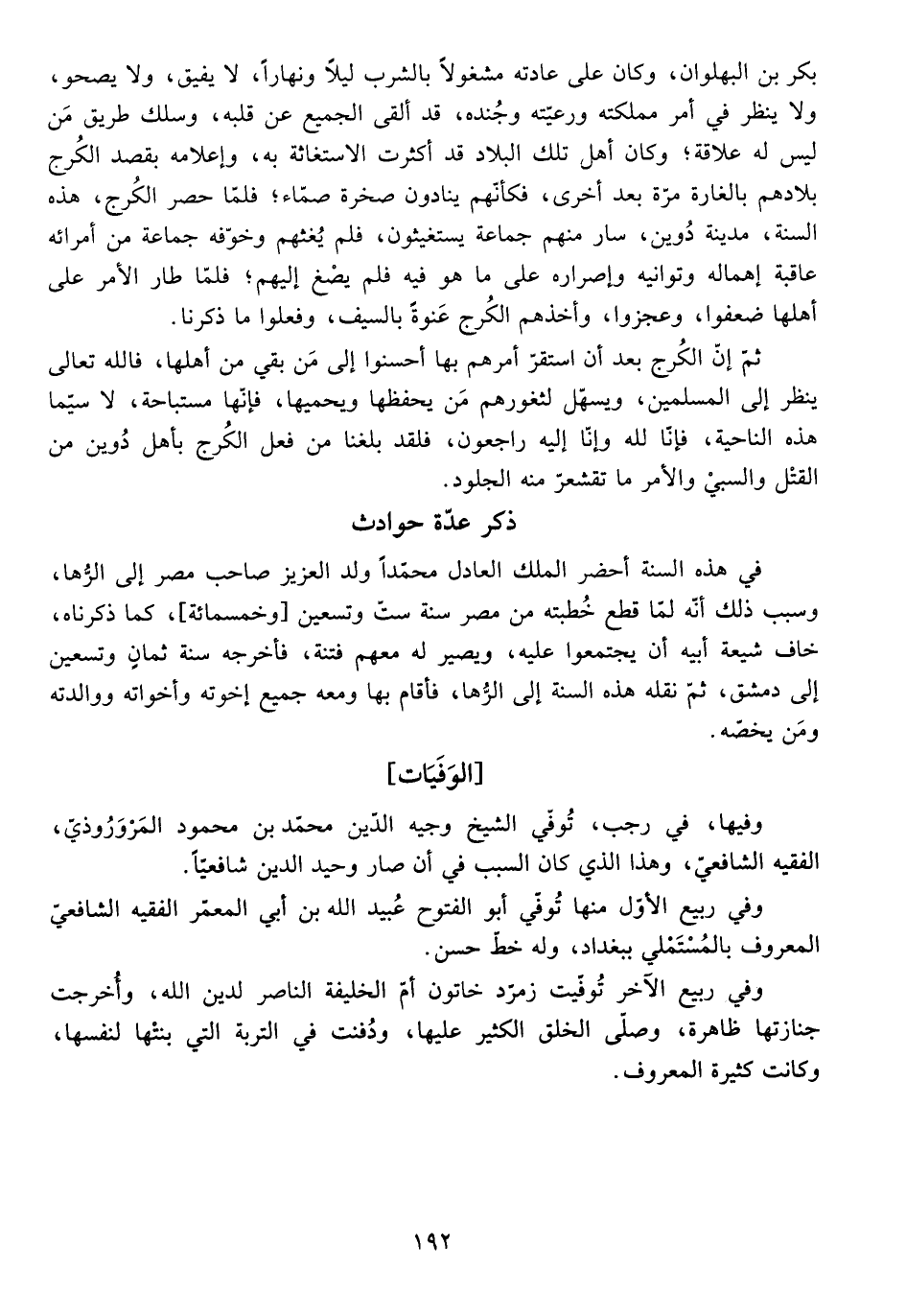 بَكْرِ بْنِ الْبَهْلَوَانِ، وَكَانَ عَلَى عَادَتِهِ مَشْغُولًا بِالشُّرْبِ لَيْلًا وَنَهَارًا، لَا يُفِيقُ، وَلَا يَصْحُو وَلَا يَنْظُرُ فِي أَمْرِ مَمْلَكَتِهِ وَرَعِيَّتِهِ وَجُنْدِهِ، قَدْ أَلْقَى الْجَمِيعَ عَنْ قَلْبِهِ، وَسَلَكَ طَرِيقَ مَنْ لَيْسَ لَهُ عَلَاقَةٌ، وَكَانَ أَهْلُ تِلْكَ الْبِلَادِ قَدْ أَكْثَرَتِ الِاسْتِغَاثَةَ بِهِ، وَإِعْلَامَهُ بِقَصْدِ الْكُرْجِ بِلَادَهُمْ بِالْغَارَةِ مَرَّةً بَعْدَ أُخْرَى، فَكَأَنَّهُمْ يُنَادُونَ صَخْرَةً صَمَّاءَ، فَلَمَّا حَصَرَ الْكُرْجُ هَذِهِ السَّنَةَ مَدِينَةَ دُوِينَ، سَارَ مِنْهُمْ جَمَاعَةٌ يَسْتَغِيثُونَ، فَلَمْ يُغِثْهُمْ وَخَوَّفَهُ جَمَاعَةٌ مِنْ أُمَرَائِهِ عَاقِبَةَ إِهْمَالِهِ وَتَوَانِيهِ وَإِصْرَارِهِ عَلَى مَا هُوَ فِيهِ فَلَمْ يُصْغِ إِلَيْهِمْ، فَلَمَّا طَالَ الْأَمْرُ عَلَى أَهْلِهَا ضَعُفُوا، وَعَجَزُوا، وَأَخَذَهُمُ الْكُرْجُ عَنْوَةً بِالسَّيْفِ وَفَعَلُوا مَا ذَكَرْنَا.