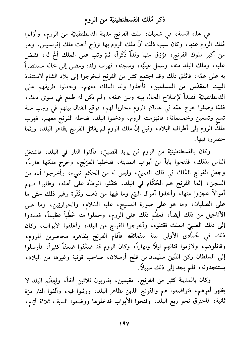 فِي هَذِهِ السَّنَةِ، فِي شَعْبَانَ، مَلَكَ الْفِرِنْجُ مَدِينَةَ الْقُسْطَنْطِينِيَّةِ مِنَ الرُّومِ وَأَزَالُوا مُلْكَ الرُّومِ عَنْهَا، وَكَانَ سَبَبُ ذَلِكَ أَنَّ مِلْكَ الرُّومِ بِهَا تَزَوَّجَ أُخْتَ مَلِكِ إِفْرِنْسِيسَ، وَهُوَ مِنْ أَكْبَرِ مُلُوكِ الْفِرِنْجِ فَرُزِقَ مِنْهَا وَلَدًا ذَكَرًا، ثُمَّ وَثَبَ عَلَى الْمُلْكِ أَخٌ لَهُ، فَقَبَضَ عَلَيْهِ. وَمَلَكَ الْبَلَدَ مِنْهُ، وَسَمَلَ عَيْنَيْهِ وَسَجَنَهُ، فَهَرَبَ وَلَدُهُ وَمَضَى إِلَى خَالِهِ مُسْتَنْصِرًا بِهِ عَلَى عَمِّهِ. فَاتَّفَقَ ذَلِكَ وَقَدِ اجْتَمَعَ كَثِيرٌ مِنَ الْفِرِنْجِ لِيَخْرُجُوا إِلَى بِلَادِ الشَّامِ لِاسْتِنْقَاذِ الْبَيْتِ الْمُقَدَّسِ مِنَ الْمُسْلِمِينَ، فَأَخَذُوا وَلَدَ الْمَلِكَ مَعَهُمْ، وَجَعَلُوا طَرِيقَهُمْ عَلَى الْقُسْطَنْطِينِيَّةِ قَصْدًا لِإِصْلَاحِ الْحَالِ بَيْنَهُ وَبَيْنَ عَمِّهِ، وَلَمْ يَكُنْ لَهُ طَمَعٌ فِي سِوَى ذَلِكَ، فَلَمَّا وَصَلُوا خَرَجَ عَمُّهُ فِي عَسَاكِرِ الرُّومِ مُحَارِبًا لَهُمْ، فَوَقَعَ الْقِتَالُ بَيْنَهُمْ فِي رَجَبٍ سَنَةَ تِسْعٍ وَتِسْعِينَ وَخَمْسِمِائَةٍ، فَانْهَزَمَتِ الرُّومُ، وَدَخَلُوا الْبَلَدَ فَدَخَلَهُ الْفِرِنْجُ مَعَهُمْ، فَهَرَبَ مِلْكُ الرُّومِ إِلَى أَطْرَافِ الْبِلَادِ، وَقِيلَ إِنَّ مِلْكَ الرُّومِ لَمْ يُقَاتِلِ الْفِرِنْجَ بِظَاهِرِ الْبَلَدِ وَإِنَّمَا حَصَرُوهُ فِيهَا.