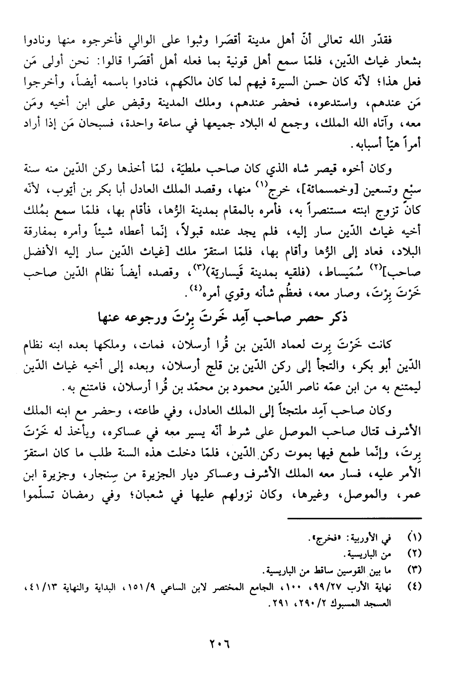 وَكَانَ صَاحِبُ آمِدَ مُلْتَجِئًا إِلَى الْمَلِكِ الْعَادِلِ، وَفِي طَاعَتِهِ، وَحَضَرَ مَعَ ابْنِهِ الْمَلِكِ الْأَشْرَفِ قِتَالَ صَاحِبِ الْمَوْصِلِ عَلَى شَرْطِ أَنَّهُ يَسِيرُ مَعَهُ فِي عَسَاكِرِهِ، وَيَأْخُذُ لَهُ خَرْتَ بِرْتَ، وَإِنَّمَا طَمِعَ فِيهَا بِمَوْتِ رُكْنِ الدِّينِ، فَلَمَّا دَخَلَتْ هَذِهِ السَّنَةُ طَلَبَ مَا كَانَ اسْتَقَرَّ الْأَمْرُ عَلَيْهِ، فَسَارَ مَعَهُ الْمَلِكُ الْأَشْرَفُ وَعَسَاكِرُ دِيَارِ الْجَزِيرَةِ مِنْ سِنْجَارَ، وَجَزِيرَةِ ابْنِ عُمَرَ، وَالْمَوْصِلِ، وَغَيْرِهَا، وَكَانَ نُزُولُهُمْ عَلَيْهَا فِي شَعْبَانَ، وَفِي رَمَضَانَ تَسَلَّمُوا