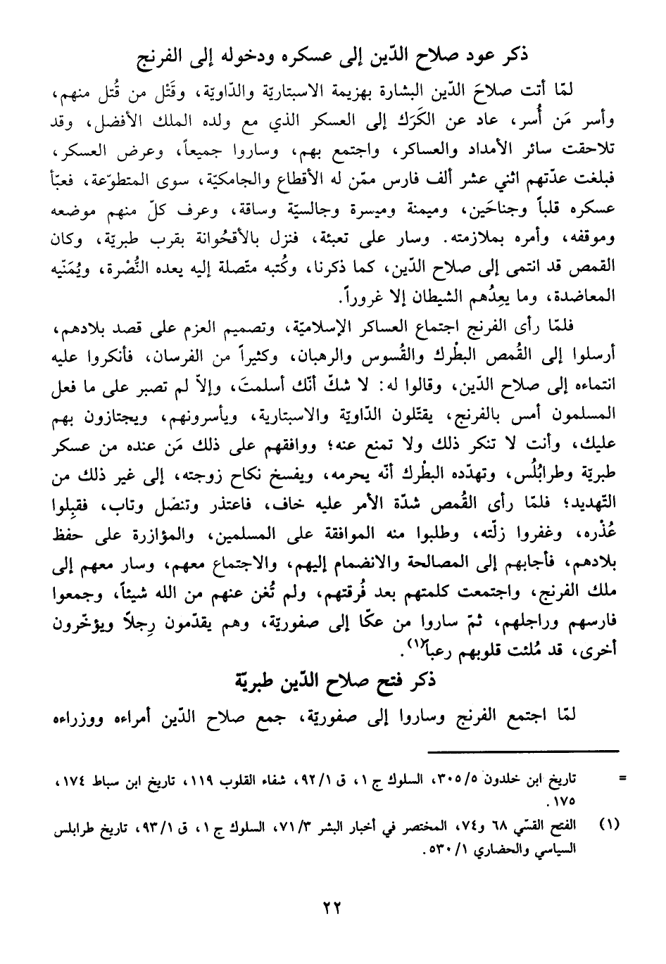 لَمَّا اجْتَمَعَ الْفِرِنْجُ وَسَارُوا إِلَى صَفُّورِيَّةَ، جَمَعَ صَلَاحُ الدِّينِ أُمَرَاءَهُ وَوُزَرَاءَهُ