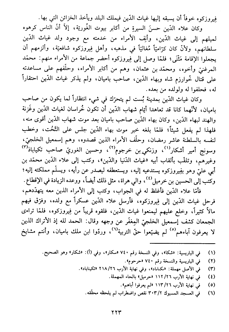 فَأَمَّا عَلَاءُ الدِّينِ فَأَغْلَظَ لَهُ فِي الْجَوَابِ، وَكَتَبَ إِلَى الْأُمَرَاءِ الَّذِينَ مَعَهُ يَتَهَدَّدُهُمْ، فَرَحَلَ غِيَاثُ الدِّينِ إِلَى فَيْرُوزَكُوه، فَأَرْسَلَ عَلَاءُ الدِّينِ عَسْكَرًا مَعَ وَلَدِهِ، وَفَرَّقَ فِيهِمْ مَالًا كَثِيرًا، وَخَلَعَ عَلَيْهِمْ لِيَمْنَعُوا غِيَاثَ الدِّينِ، فَلَقَوْهُ قَرِيبًا مِنْ فَيْرُوزَكُوه، فَلَمَّا تَرَاءَى الْجَمْعَانِ كَشَفَ إِسْمَاعِيلُ الْخُلْجِيُّ الْمِغْفَرَ عَنْ وَجْهِهِ وَقَالَ: الْحَمْدُ لِلَّهِ إِذِ الْأَتْرَاكُ الَّذِينَ لَا يَعْرِفُونَ آبَاءَهُمْ لَمْ يُضَيِّعُوا حَقَّ التَّرْبِيَةِ، وَرَدُّوا ابْنَ مَلِكِ بَامِيَانَ، وَأَنْتُمْ مَشَايِخُ