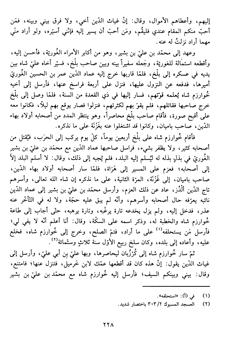 فَأَقَامَ خُوَارِزْمُ شَاهْ عَلَى بَلْخَ أَرْبَعِينَ يَوْمًا، كُلَّ يَوْمٍ يَرْكَبُ إِلَى الْحَرْبِ، فَيُقْتَلُ مِنْ أَصْحَابِهِ كَثِيرٌ، وَلَا يَظْفَرُ بِشَيْءٍ فَرَاسَلَ صَاحِبَهَا عِمَادَ الدِّينِ مَعَ مُحَمَّدِ بْنِ عَلِيِّ بْنِ بَشِيرٍ الْغُورِيِّ فِي بَذْلٍ بَذَلَهُ لَهُ لِيُسَلِّمَ إِلَيْهِ الْبَلَدَ، فَلَمْ يُجِبْهُ إِلَى ذَلِكَ، وَقَالَ: لَا أُسَلِّمُ الْبَلَدَ إِلَّا إِلَى أَصْحَابِهِ، فَعَزَمَ عَلَى الْمَسِيرِ إِلَى هَرَاةَ، فَلَمَّا سَارَ أَصْحَابُهُ أَوْلَادُ بَهَاءِ الدِّينِ، صَاحِبِ بَامِيَانَ، إِلَى غَزْنَةَ، الْمَرَّةَ الثَّانِيَةَ - عَلَى مَا نَذْكُرُهُ إِنْ شَاءَ اللَّهُ تَعَالَى - وَأَسَرَهُمْ تَاجُ الدِّينِ أَلْدِزُ، عَادَ عَنْ ذَلِكَ الْعَزْمِ، وَأَرْسَلَ مُحَمَّدَ بْنَ عَلِيِّ بْنِ بَشِيرٍ إِلَى عِمَادِ الدِّينِ نَائِبِهِ يُعَرِّفُهُ حَالَ أَصْحَابِهِ وَأَسْرَهُمْ، وَأَنَّهُ لَمْ يَبْقَ عَلَيْهِ حُجَّةٌ، وَلَا لَهُ فِي التَّأَخُّرِ عَنْهُ عُذْرٌ، فَدَخَلَ إِلَيْهِ، وَلَمْ يَزَلْ يَخْدَعُهُ، تَارَةً يُرَغِّبُهُ وَتَارَةً يُرَهِّبُهُ حَتَّى أَجَابَ إِلَى طَاعَةِ خُوَارِزْمَ شَاهْ وَالْخُطْبَةِ لَهُ، وَذِكْرِ اسْمِهِ عَلَى السِّكَّةِ، وَقَالَ: أَنَا أَعْلَمُ أَنَّهُ لَا يَفِي لِي، فَأَرْسَلَ مَنْ يَسْتَحْلِفُهُ عَلَى مَا أَرَادَ، فَتَمَّ الصُّلْحُ، وَخَرَجَ إِلَى خُوَارِزْمَ شَاهْ، فَخَلَعَ عَلَيْهِ، وَأَعَادَهُ إِلَى بَلَدِهِ، وَكَانَ سَلْخَ رَبِيعٍ الْأَوَّلِ سَنَةَ ثَلَاثٍ وَسِتِّمِائَةٍ.