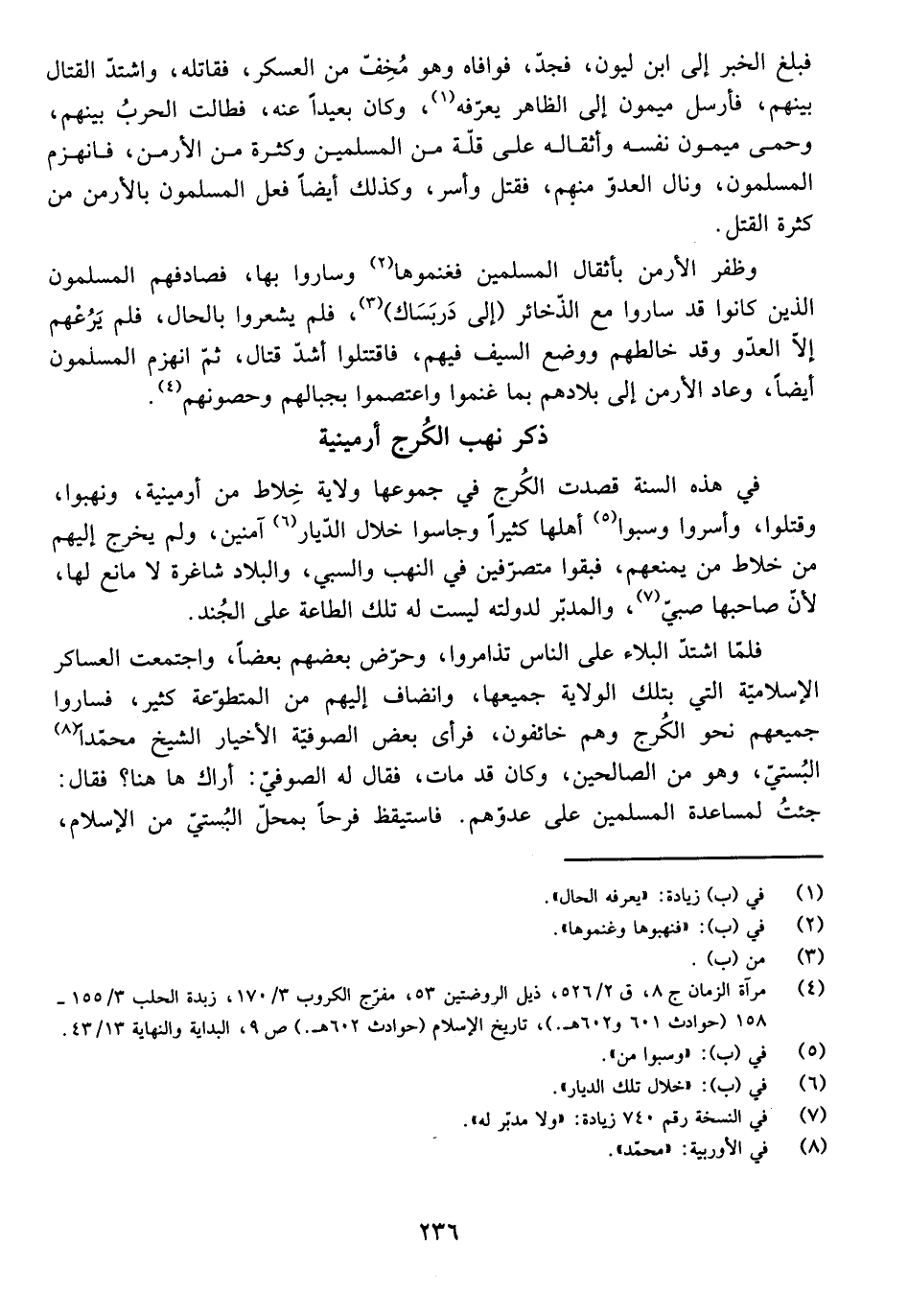 وَظَفِرَ الْأَرْمَنُ بِأَثْقَالِ الْمُسْلِمِينَ فَغَنِمُوهَا وَسَارُوا بِهَا، فَصَادَفَهُمُ الْمُسْلِمُونَ الَّذِينَ كَانُوا قَدْ سَارُوا مَعَ الذَّخَائِرِ (إِلَى دِرِبْسَاكَ) ، فَلَمْ يَشْعُرُوا بِالْحَالِ، فَلَمْ يَرُعْهُمْ إِلَّا الْعَدُوُّ قَدْ خَالَطَهُمْ وَوَضَعَ السَّيْفَ فِيهِمْ، فَاقْتَتَلُوا أَشَدَّ قِتَالٍ، ثُمَّ انْهَزَمَ الْمُسْلِمُونَ أَيْضًا، وَعَادَ الْأَرْمَنُ إِلَى بِلَادِهِمْ بِمَا غَنِمُوا وَاعْتَصَمُوا بِجِبَالِهِمْ وَحُصُونِهِمْ.