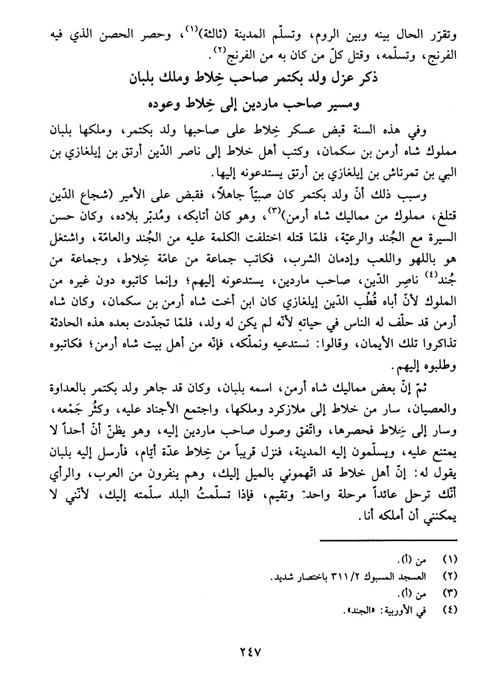 ثُمَّ إِنَّ بَعْضَ مَمَالِيكِ شَاهْ أَرْمَنَ، اسْمُهُ بِلْبَانُ، وَكَانَ قَدْ جَاهَرَ وَلَدَ بُكْتُمُرَ بِالْعَدَاوَةِ وَالْعِصْيَانِ، سَارَ مِنْ خِلَاطَ إِلَى مَلَازَكُرْدَ وَمَلَكَهَا، وَاجْتَمَعَ الْأَجْنَادُ عَلَيْهِ، وَكَثُرَ جَمْعُهُ، وَسَارَ إِلَى خِلَاطَ فَحَصَرَهَا، وَاتَّفَقَ وَصُولَ صَاحِبِ مَارْدِينَ إِلَيْهَا، وَهُوَ يَظُنُّ أَنَّ أَحَدًا لَا يَمْتَنِعُ عَلَيْهِ، وَيُسَلِّمُونَ إِلَيْهِ الْمَدِينَةَ، فَنَزَلَ قَرِيبًا مِنْ خِلَاطَ عِدَّةَ أَيَّامٍ، فَأَرْسَلَ إِلَيْهِ بِلْبَانُ يَقُولُ لَهُ: إِنَّ أَهْلَ خِلَاطَ قَدِ اتَّهَمُونِي بِالْمَيْلِ إِلَيْكَ، وَهُمْ يَنْفِرُونَ مِنَ الْعَرَبِ، وَالرَّأْيُ أَنَّكَ تَرْحَلُ عَائِدًا مَرْحَلَةً وَاحِدَةً وَتُقِيمُ، فَإِذَا تَسَلَّمَتُ الْبَلَدَ سَلَّمْتُهُ إِلَيْكَ، لِأَنَّنِي لَا يُمْكِنُنِي أَنْ أَمْلِكَهُ أَنَا.