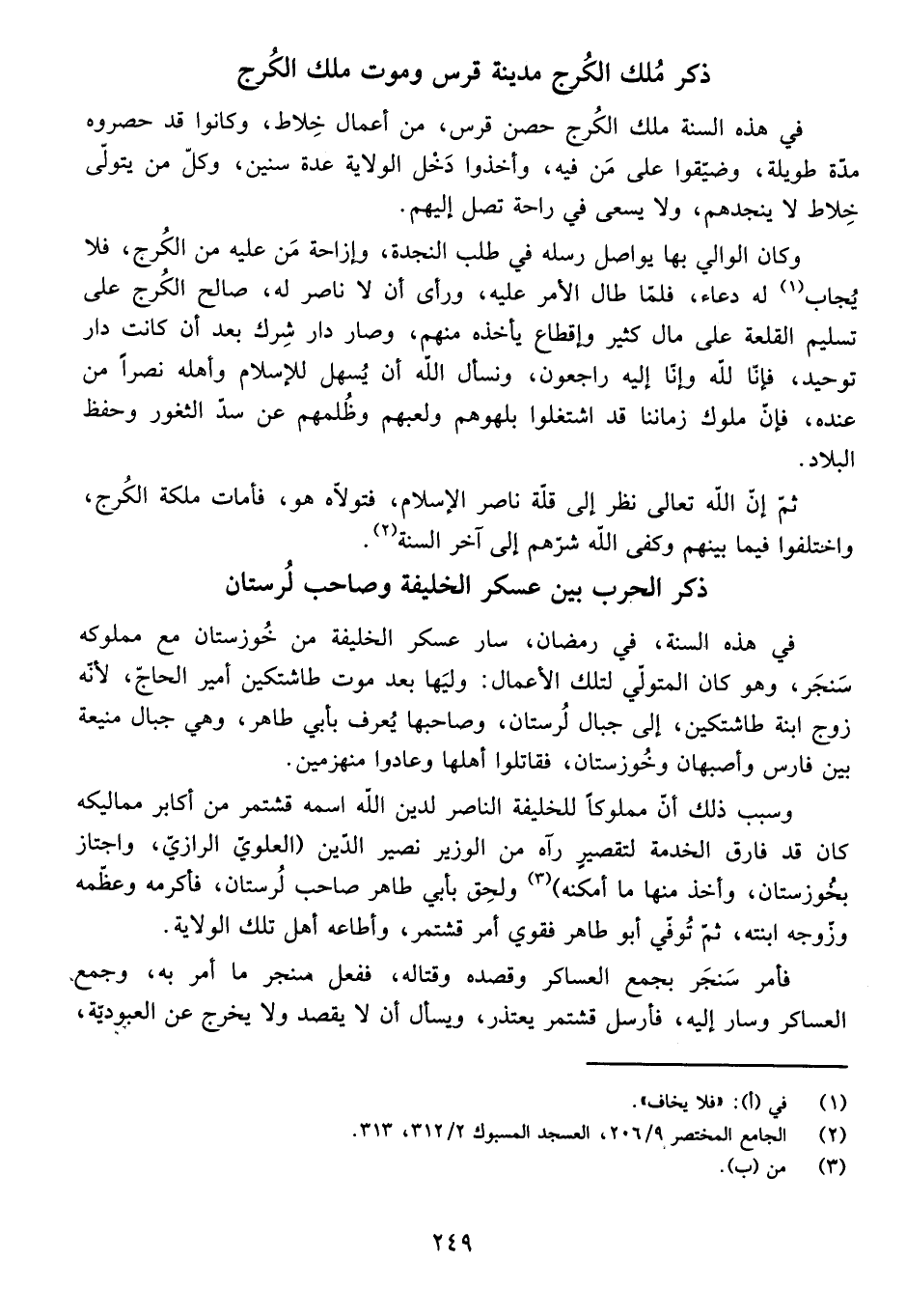 فِي هَذِهِ السَّنَةِ، فِي رَمَضَانَ، سَارَ عَسْكَرُ الْخَلِيفَةِ مِنْ خُوزِسْتَانَ مَعَ مَمْلُوكِهِ سَنْجَرَ - وَهُوَ كَانَ الْمُتَوَلِّيَ لِتِلْكَ الْأَعْمَالِ، وَلِيَهَا بَعْدَ مَوْتِ طَاشْتِكِينَ أَمِيرِ الْحَاجِّ، لِأَنَّهُ زَوْجُ ابْنَةِ طَاشْتِكِينَ - إِلَى جِبَالِ لُرُسْتَانَ، وَصَاحِبُهَا يُعْرَفُ بِأَبِي طَاهِرٍ - وَهِيَ جِبَالٌ مَنِيعَةٌ بَيْنَ فَارِسَ وَأَصْبَهَانَ وَخُوزِسْتَانَ - فَقَاتَلُوا أَهْلَهَا وَعَادُوا مُنْهَزِمِينَ.
