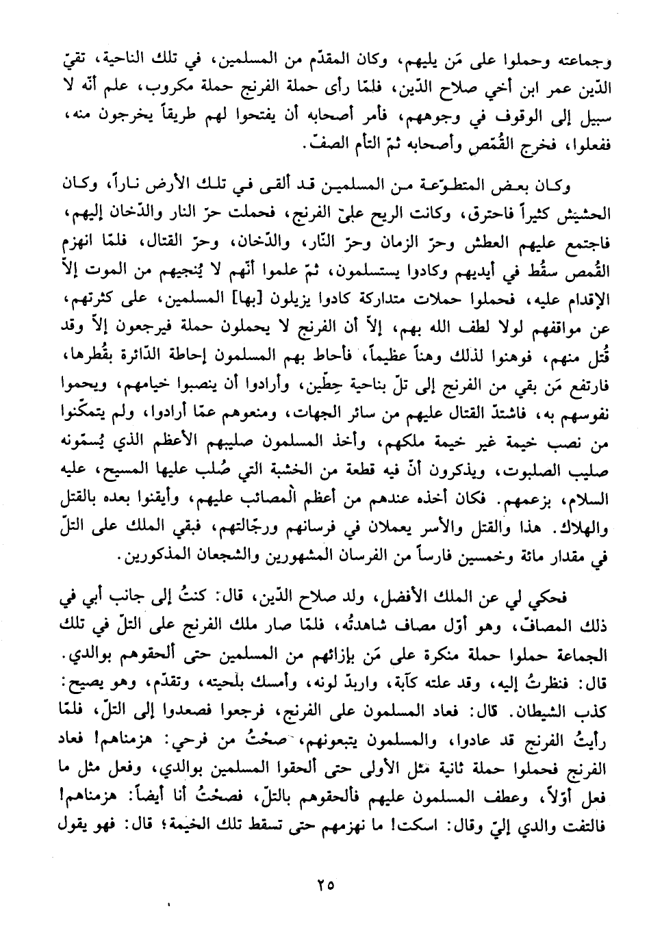 قَالَ: فَنَظَرْتُ إِلَيْهِ، وَقَدْ عَلَتْهُ كَآبَةٌ، وَارْبَدَّ لَوْنُهُ، وَأَمْسَكَ بِلِحْيَتِهِ، وَتَقَدَّمَ، وَهُوَ يَصِيحُ: كَذَبَ الشَّيْطَانُ، قَالَ: فَعَادَ الْمُسْلِمُونَ عَلَى الْفِرِنْجِ، فَرَجَعُوا إِلَى التَّلِّ، فَلَمَّا رَأَيْتُ الْفِرِنْجَ قَدْ عَادُوا، وَالْمُسْلِمُونَ يَتْبَعُونَهُمْ، صِحْتُ مِنْ فَرَحِي: هَزَمْنَاهُمْ! فَعَادَ الْفِرِنْجُ فَحَمَلُوا حَمْلَةً ثَانِيَةً مِثْلَ الْأُولَى حَتَّى أَلْحَقُوا الْمُسْلِمِينَ بِوَالِدِي، وَفَعَلَ مِثْلَ مَا فَعَلَ أَوَّلًا.