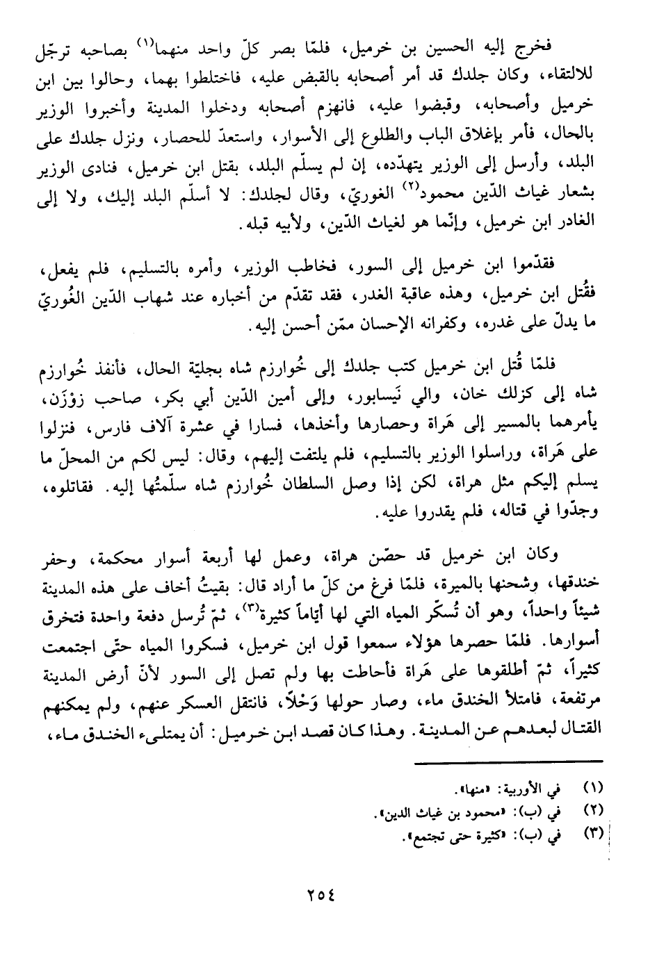 فَقَدَّمُوا ابْنَ خَرْمِيلَ إِلَى السُّورِ، فَخَاطَبَ الْوَزِيرَ، وَأَمَرَهُ بِالتَّسْلِيمِ، فَلَمْ يَفْعَلْ، فَقُتِلَ ابْنُ خَرْمِيلَ، وَهَذِهِ عَاقِبَةُ الْغَدْرِ، فَقَدْ تَقَدَّمَ مِنْ أَخْبَارِهِ عِنْدَ شِهَابِ الدِّينِ الْغُورِيِّ مَا يَدُلُّ عَلَى غَدْرِهِ، وَكُفْرَانِهِ الْإِحْسَانَ مِمَّنْ أَحْسَنَ إِلَيْهِ.