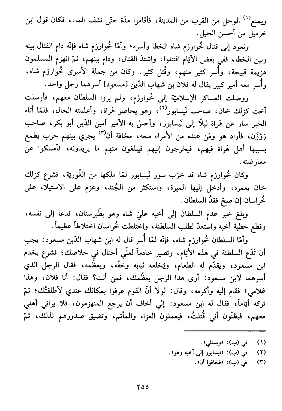 وَنَعُودُ إِلَى قِتَالِ خُوَارِزْمَ شَاهِ الْخَطَا وَأَسْرِهِ، وَأَمَّا خُوَارِزْمُ شَاهْ فَإِنَّهُ دَامَ الْقِتَالُ بَيْنَهُ وَبَيْنَ الْخَطَا، فَفِي بَعْضِ الْأَيَّامِ اقْتَتَلُوا، وَاشْتَدَّ الْقِتَالُ، وَدَامَ بَيْنَهُمْ، ثُمَّ انْهَزَمَ الْمُسْلِمُونَ هَزِيمَةً قَبِيحَةً، وَأُسِرَ كَثِيرٌ مِنْهُمْ، وَقُتِلَ كَثِيرٌ. وَكَانَ مِنْ جُمْلَةِ الْأَسْرَى خُوَارِزْمُ شَاهْ، وَأُسِرَ مَعَهُ أَمِيرٌ كَبِيرٌ يُقَالُ لَهُ فُلَانُ بْنُ شِهَابِ الدِّينِ [مَسْعُودٍ] أَسَرَهُمَا رَجُلٌ وَاحِدٌ.