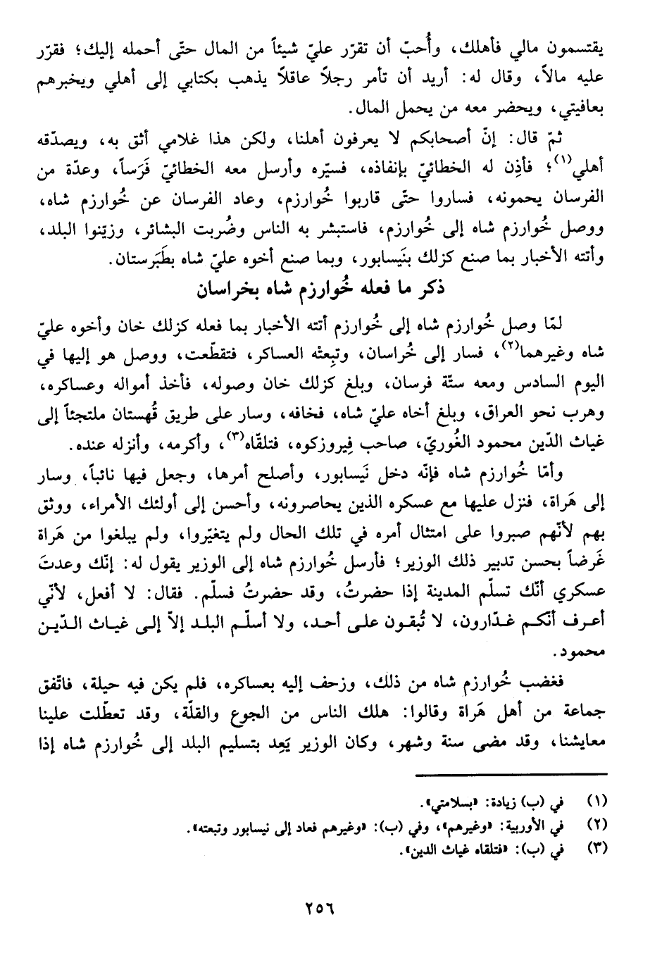 وَأَمَّا خُوَارِزْمُ شَاهْ فَإِنَّهُ دَخَلَ نَيْسَابُورَ، وَأَصْلَحَ أَمْرَهَا، وَجَعَلَ فِيهَا نَائِبًا، وَسَارَ إِلَى هَرَاةَ، فَنَزَلَ عَلَيْهَا مَعَ عَسْكَرِهِ الَّذِينَ يُحَاصِرُونَهُ، وَأَحْسَنَ إِلَى أُولَئِكَ الْأُمَرَاءِ، وَوَثِقَ بِهِمْ لِأَنَّهُمْ صَبَرُوا عَلَى امْتِثَالِ أَمْرِهِ فِي تِلْكَ الْحَالِ وَلَمْ يَتَغَيَّرُوا، وَلَمْ يَبْلُغُوا مِنْ هَرَاةَ غَرَضًا بِحُسْنِ تَدْبِيرِ ذَلِكَ الْوَزِيرِ، فَأَرْسَلَ خُوَارِزْمُ شَاهْ إِلَى الْوَزِيرِ يَقُولُ لَهُ: إِنَّكَ وَعَدْتَ عَسْكَرِي أَنَّكَ تُسَلِّمُ الْمَدِينَةَ إِذَا حَضَرْتُ، وَقَدْ حَضَرْتُ فَسَلِّمْ. فَقَالَ: لَا أَفْعَلُ، لِأَنِّي أَعْرِفُ أَنَّكُمْ غَدَّارُونَ، لَا تُبْقُونَ عَلَى أَحَدٍ، وَلَا أُسَلِّمُ الْبَلَدَ إِلَّا إِلَى غِيَاثِ الدِّينِ مَحْمُودٍ.