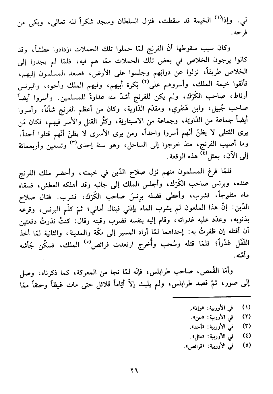 فَلَمَّا فَرَغَ الْمُسْلِمُونَ مِنْهُمْ نَزَلَ صَلَاحُ الدِّينِ فِي خَيْمَتِهِ، وَأُحْضِرُ مَلِكُ الْفِرِنْجِ عِنْدَهُ، وَبِرِنْسُ صَاحِبُ الْكَرَكِ، وَأَجْلَسَ الْمَلِكَ إِلَى جَانِبِهِ وَقَدْ أَهْلَكَهُ الْعَطَشُ، فَسَقَاهُ مَاءً مَثْلُوجًا، فَشَرِبَ، وَأَعْطَى فَضْلَهُ بِرِنْسَ صَاحِبَ الْكَرَكِ، فَشَرِبَ.