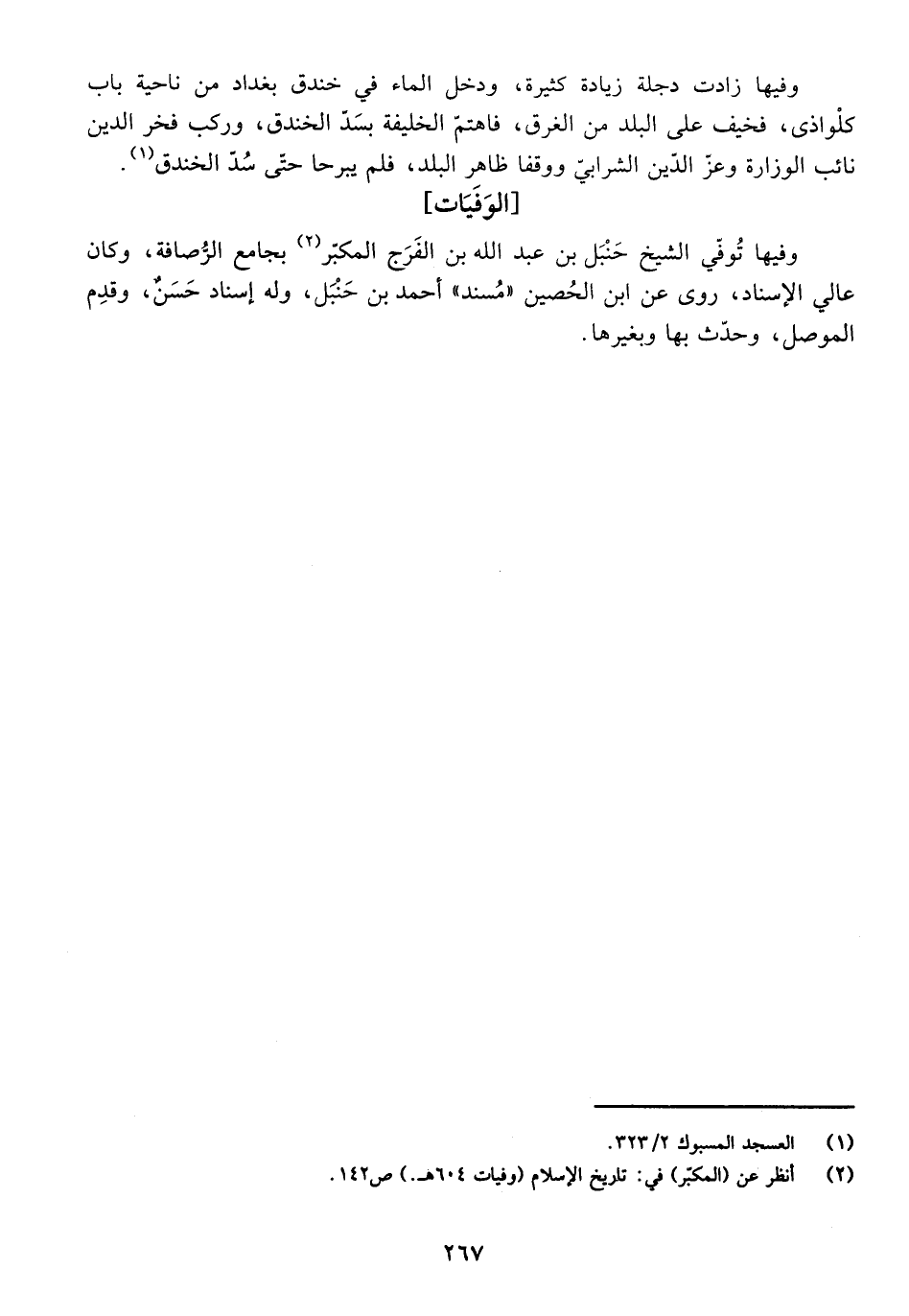 وَفِيهَا تُوُفِّيَ الشَّيْخُ حَنْبَلُ بْنُ عَبْدِ اللَّهِ بْنِ الْفَرَجِ الْمُكَبِّرُ بِجَامِعِ الرُّصَافَةِ، وَكَانَ عَالِيَ الْإِسْنَادِ، رَوَى عَنِ ابْنِ الْحُصَيْنِ مُسْنَدَ أَحْمَدَ بْنِ حَنْبَلٍ، وَلَهُ إِسْنَادٌ حَسَنٌ، وَقَدِمَ الْمَوْصِلَ، وَحَدَّثَ بِهَا وَبِغَيْرِهَا.