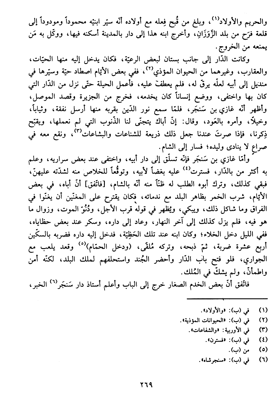 وَأَمَّا غَازِي بْنُ سَنْجَرَ فَإِنَّهُ تَسَلَّقَ إِلَى دَارِ أَبِيهِ، وَاخْتَفَى عِنْدَ بَعْضِ سَرَارِيهِ، وَعَلِمَ بِهِ أَكْثَرُ مَنْ بِالدَّارِ، فَسَتَرَتْ عَلَيْهِ بُغْضًا لِأَبِيهِ، وَتَوَقُّعًا لِلْخَلَاصِ مِنْهُ لِشِدَّتِهِ عَلَيْهِنَّ، فَبَقِيَ كَذَلِكَ، وَتَرَكَ أَبُوهُ الطَّلَبَ لَهُ ظَنًّا مِنْهُ أَنَّهُ بِالشَّامِ فَاتَّفَقَ أَنَّ أَبَاهُ، فِي بَعْضِ الْأَيَّامِ، شَرِبَ الْخَمْرَ بِظَاهِرِ الْبَلَدِ مَعَ نُدَمَائِهِ، فَكَانَ يَقْتَرِحُ عَلَى الْمُغَنِّينَ أَنْ يُغَنُّوا فِي الْفِرَاقِ وَمَا شَاكَلَ ذَلِكَ، وَيَبْكِي، وَيُظْهِرُ فِي قَوْلِهِ قُرْبَ الْأَجَلِ، وَدُنُوَّ الْمَوْتِ، وَزَوَالَ مَا هُوَ فِيهِ، فَلَمْ يَزَلْ كَذَلِكَ إِلَى آخَرِ النَّهَارِ، وَعَادَ إِلَى دَارِهِ، وَسَكِرَ عِنْدَ بَعْضِ حَظَايَاهُ، فَفِي اللَّيْلِ دَخَلَ الْخَلَاءَ ; وَكَانَ ابْنُهُ عِنْدَ تِلْكَ الْحَظِيَّةِ، فَدَخَلَ إِلَيْهِ دَارَهُ فَضَرَبَهُ بِالسِّكِّينِ أَرْبَعَ عَشْرَةَ ضَرْبَةً، ثُمَّ ذَبَحَهُ، وَتَرَكَهُ مُلْقًى، وَدَخَلَ الْحَمَّامَ، وَقَعَدَ يَلْعَبُ مَعَ الْجَوَارِي، فَلَوْ فَتَحَ بَابَ الدَّارِ وَأَحْضَرَ الْجُنْدَ وَاسْتَحْلَفَهُمْ لِمُلْكِ الْبَلَدِ، لَكِنَّهُ أَمِنَ وَاطْمَأَنَّ، وَلَمْ يَشُكَّ فِي الْمُلْكِ.
