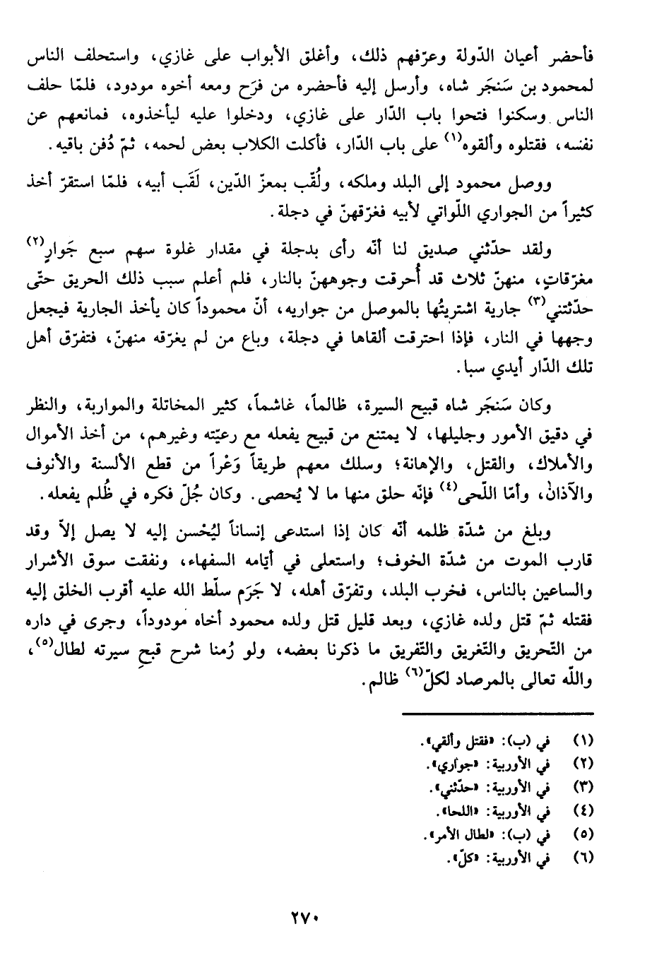 وَبَلَغَ مِنْ شِدَّةِ ظُلْمِهِ أَنَّهُ كَانَ إِذَا اسْتَدْعَى إِنْسَانًا لِيُحْسِنَ إِلَيْهِ لَا يَصِلُ إِلَّا وَقَدْ قَارَبَ الْمَوْتَ مِنْ شِدَّةِ الْخَوْفِ ; وَاسْتَعْلَى فِي أَيَّامِهِ السُّفَهَاءُ، وَنَفَقَتْ سُوقُ الْأَشْرَارِ وَالسَّاعِينَ بِالنَّاسِ، فَخَرَبَ الْبَلَدُ، وَتَفَرَّقَ أَهْلُهُ، لَا جَرَمَ سَلَّطَ اللَّهُ عَلَيْهِ أَقْرَبَ الْخَلْقِ إِلَيْهِ فَقَتَلَهُ، ثُمَّ قُتِلَ وَلَدُهُ غَازِي، وَبَعْدَ قَلِيلٍ قَتَلَ وَلَدُهُ مَحْمُودٌ أَخَاهُ مَوْدُودًا، وَجَرَى فِي دَارِهِ مِنَ التَّحْرِيقِ وَالتَّغْرِيقِ وَالتَّفْرِيقِ مَا ذَكَرْنَا بَعْضَهُ، وَلَوْ رُمْنَا شَرْحَ قُبْحِ سِيرَتِهِ لَطَالَ، وَاللَّهُ تَعَالَى بِالْمِرْصَادِ لِكُلِّ ظَالِمٍ.