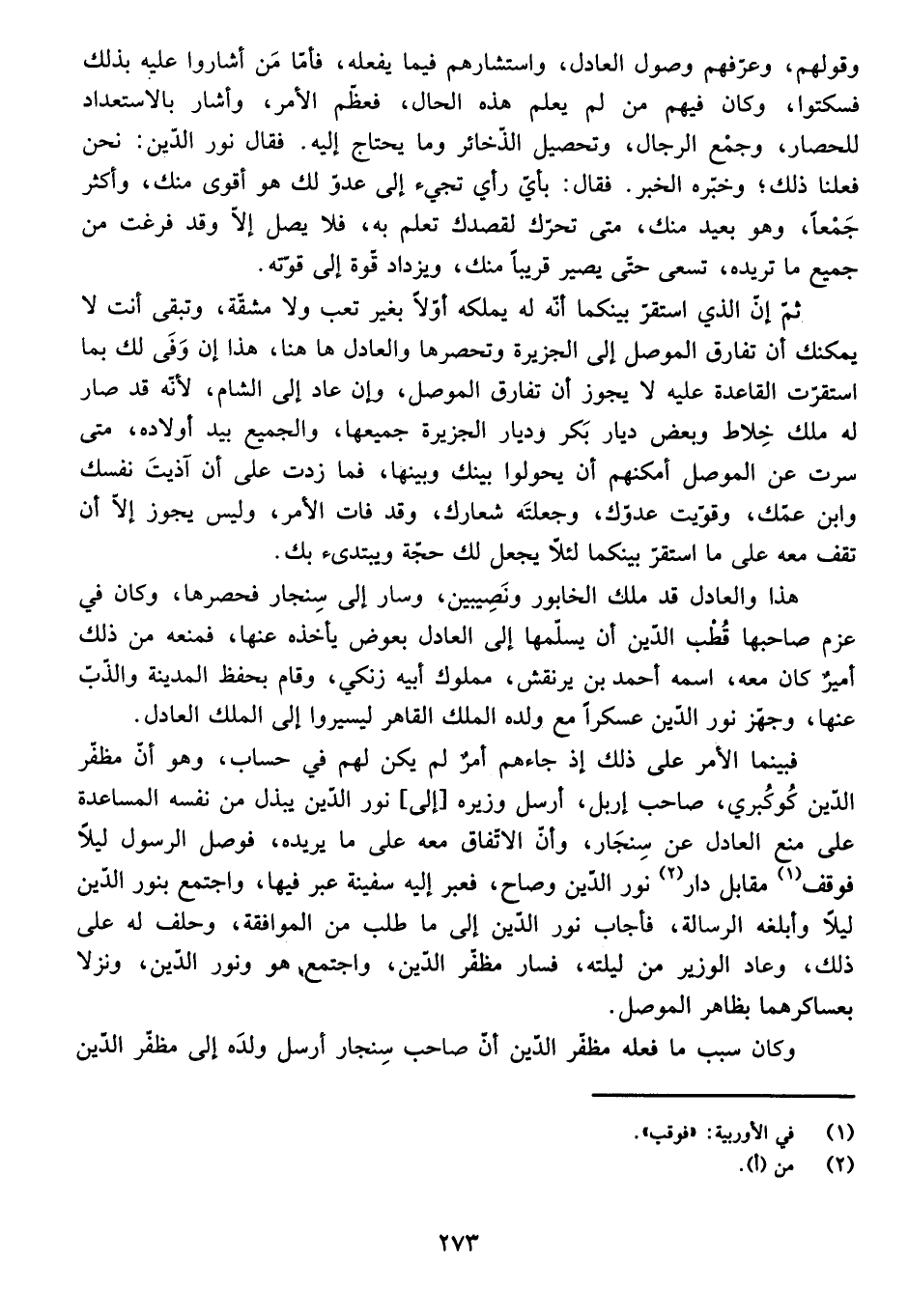 ثُمَّ إِنَّ الَّذِي اسْتَقَرَّ بَيْنَكُمَا أَنَّهُ لَهُ يَمْلِكُهُ أَوْلًا بِغَيْرِ تَعَبٍ وَلَا مَشَقَّةٍ، وَتَبْقَى أَنْتَ لَا يُمْكِنُكَ أَنْ تُفَارِقَ الْمَوْصِلَ إِلَى الْجَزِيرَةِ وَتَحْصُرَهَا وَالْعَادِلُ هَاهُنَا، هَذَا إِنْ وَفَّى لَكَ بِمَا اسْتَقَرَّتِ الْقَاعِدَةُ عَلَيْهِ لَا يَجُوزُ أَنْ تُفَارِقَ الْمَوْصِلَ، وَإِنْ عَادَ إِلَى الشَّامِ، لِأَنَّهُ قَدْ صَارَ لَهُ مُلْكُ خِلَاطَ، وَبَعْضُ دِيَارِ بَكْرٍ، وَدِيَارُ الْجَزِيرَةِ جَمِيعُهَا، وَالْجَمِيعُ بِيَدِ أَوْلَادِهِ مَتَى سِرْتَ عَنِ الْمَوْصِلِ أَمْكَنَهُمْ أَنْ يَحُولُوا بَيْنَكَ وَبَيْنَهَا، فَمَا زِدْتَ عَلَى أَنْ آذَيْتَ نَفْسَكَ وَابْنَ عَمِّكَ، وَقَوَّيْتَ عَدُوَّكَ، وَجَعَلْتَهُ شِعَارَكَ، وَقَدْ فَاتَ الْأَمْرُ، وَلَيْسَ يَجُوزُ إِلَّا أَنْ تَقِفَ مَعَهُ عَلَى مَا اسْتَقَرَّ بَيْنَكُمَا لِئَلَّا يَجْعَلَ لَكَ حُجَّةً وَيَبْتَدِئُ بِكَ.