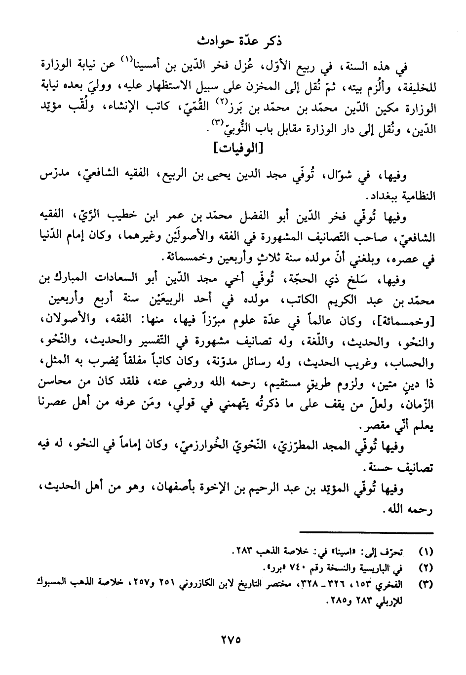 وَفِيهَا تُوُفِّيَ فُخْرُ الدِّينِ أَبُو الْفَضْلِ مُحَمَّدُ بْنُ عُمَرَ بْنِ خَطِيبِ الرَّيِّ، الْفَقِيهُ الشَّافِعِيُّ صَاحِبُ التَّصَانِيفِ الْمَشْهُورَةِ فِي الْفِقْهِ وَالْأُصُولِ وَغَيْرِهِمَا، وَكَانَ إِمَامَ الدُّنْيَا فِي عَصْرِهِ، وَبَلَغَنِي أَنَّ مَوْلِدَهُ سَنَةَ ثَلَاثٍ وَأَرْبَعِينَ وَخَمْسِمِائَةٍ.