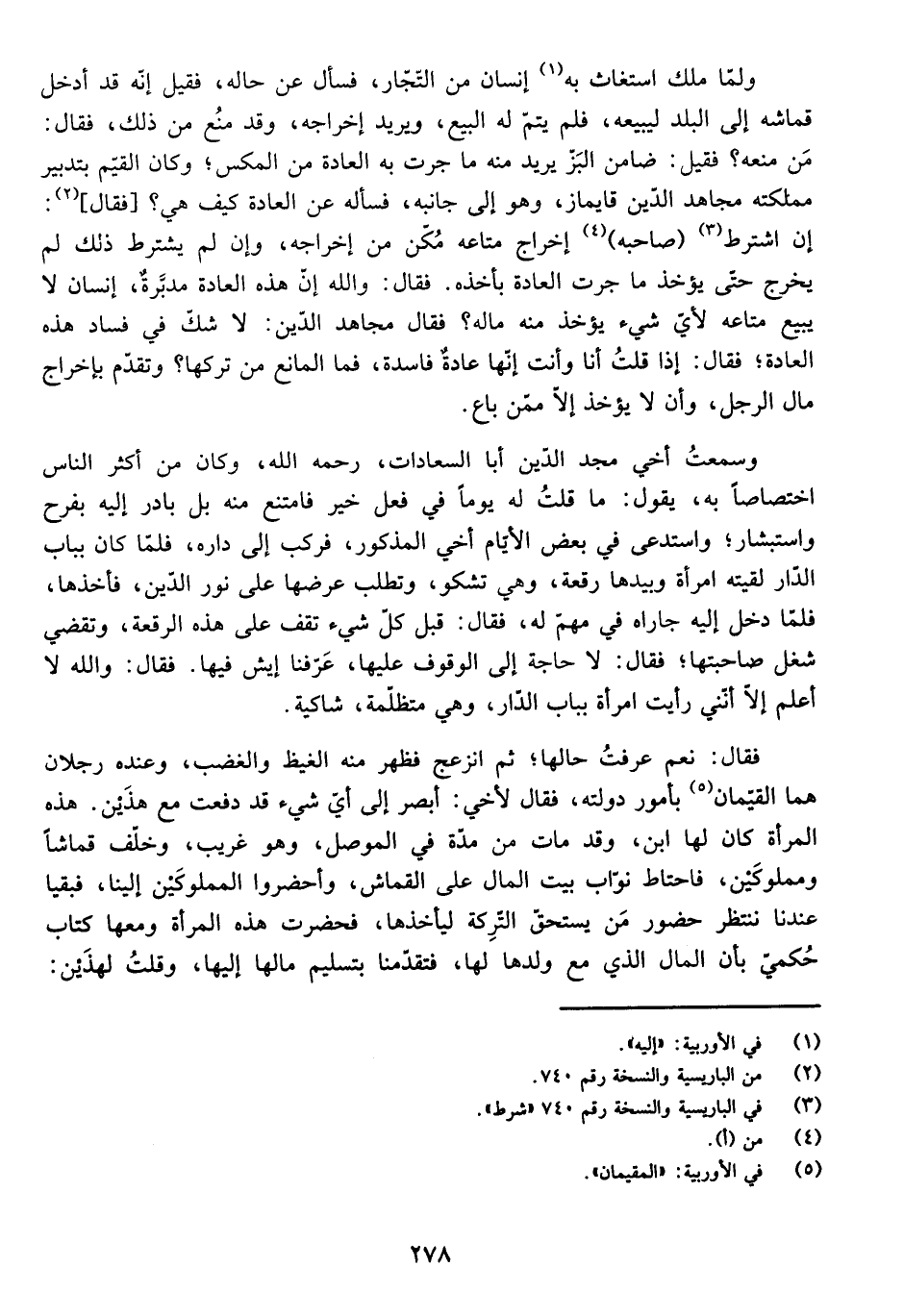 فَقَالَ: نَعَمْ عَرَفْتُ حَالَهَا ثُمَّ انْزَعَجَ فَظَهَرَ مِنْهُ الْغَيْظُ وَالْغَضَبُ، وَعِنْدَهُ رَجُلَانِ هُمَا الْقَيِّمَانِ بِأُمُورِ دَوْلَتِهِ، فَقَالَ لِأَخِيهِ: أَبْصِرْ إِلَى أَيِّ شَيْءٍ قَدْ دَفَعَتْ مَعَ هَذَيْنِ. هَذِهِ الْمَرْأَةُ كَانَ لَهَا ابْنٌ، وَقَدْ مَاتَ مِنْ مُدَّةٍ فِي الْمَوْصِلِ، وَهُوَ غَرِيبٌ، وَخَلَّفَ قُمَاشًا وَمَمْلُوكَيْنِ، فَاحْتَاطَ نُوَّابُ بَيْتِ الْمَالِ عَلَى الْقُمَاشِ، وَأَحْضَرُوا الْمَمْلُوكَيْنِ إِلَيْنَا، فَبَقِيَا عِنْدَنَا نَنْتَظِرُ حُضُورَ مَنْ يَسْتَحِقُّ التَّرِكَةَ لِيَأْخُذَهَا، فَحَضَرَتْ هَذِهِ الْمَرْأَةُ وَمَعَهَا كِتَابٌ، حُكْمِي بِأَنَّ الْمَالَ الَّذِي مَعَ وَلَدِهَا لَهَا، فَتَقَدَّمْنَا بِتَسْلِيمِ مَالِهَا إِلَيْهَا، وَقُلْتُ لِهَذَيْنِ: