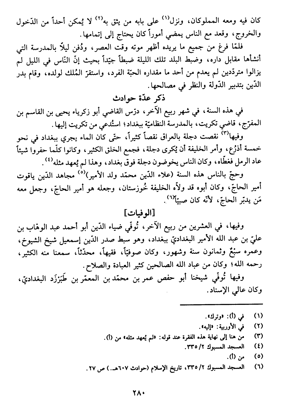 وَفِيهَا، فِي الْعِشْرِينَ مِنْ رَبِيعٍ الْآخَرِ، تُوُفِّيَ ضِيَاءُ الدِّينِ أَبُو أَحْمَدَ عَبْدُ الْوَهَّابِ بْنُ عَلِيِّ بْنِ عَبْدِ اللَّهِ الْأَمِيرُ الْبَغْدَادِيُّ بِبَغْدَادَ، وَهُوَ سَبْطُ صَدْرِ الدِّينِ إِسْمَاعِيلَ شَيْخِ الشُّيُوخِ، وَعُمُرُهُ سَبْعٌ وَثَمَانُونَ سَنَةً وَشُهُورٌ، وَكَانَ صُوفِيًّا، فَقِيهًا، مُحَدِّثًا، سَمِعْنَا مِنْهُ الْكَثِيرَ - رَحِمَهُ اللَّهُ - وَكَانَ مِنْ عِبَادِ اللَّهِ الصَّالِحِينَ كَثِيرَ الْعِبَادَةِ وَالصَّلَاحِ.