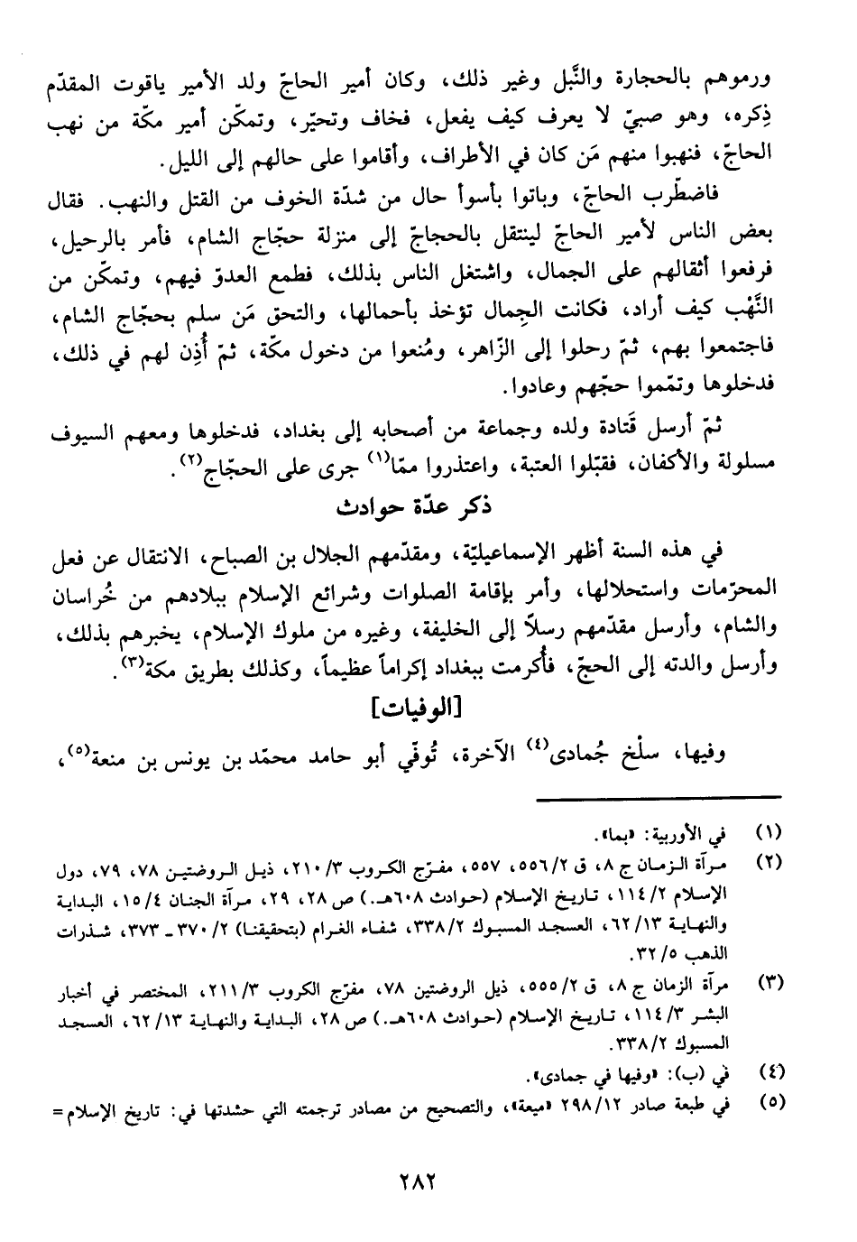 وَرَمَوْهُمْ بِالْحِجَارَةِ وَالنَّبْلِ وَغَيْرِ ذَلِكَ، وَكَانَ أَمِيرُ الْحَاجِّ وَلَدَ الْأَمِيرِ يَاقُوتَ الْمُقَدَّمَ ذِكْرُهُ، وَهُوَ صَبِيٌّ لَا يَعْرِفُ كَيْفَ يَفْعَلُ، فَخَافَ وَتَحَيَّرَ وَتَمَكَّنَ أَمِيرُ مَكَّةَ مَنْ نَهْبِ الْحَاجِّ، فَنَهَبُوا مِنْهُمْ مَنْ كَانَ فِي الْأَطْرَافِ، وَأَقَامُوا عَلَى حَالِهِمْ إِلَى اللَّيْلِ.