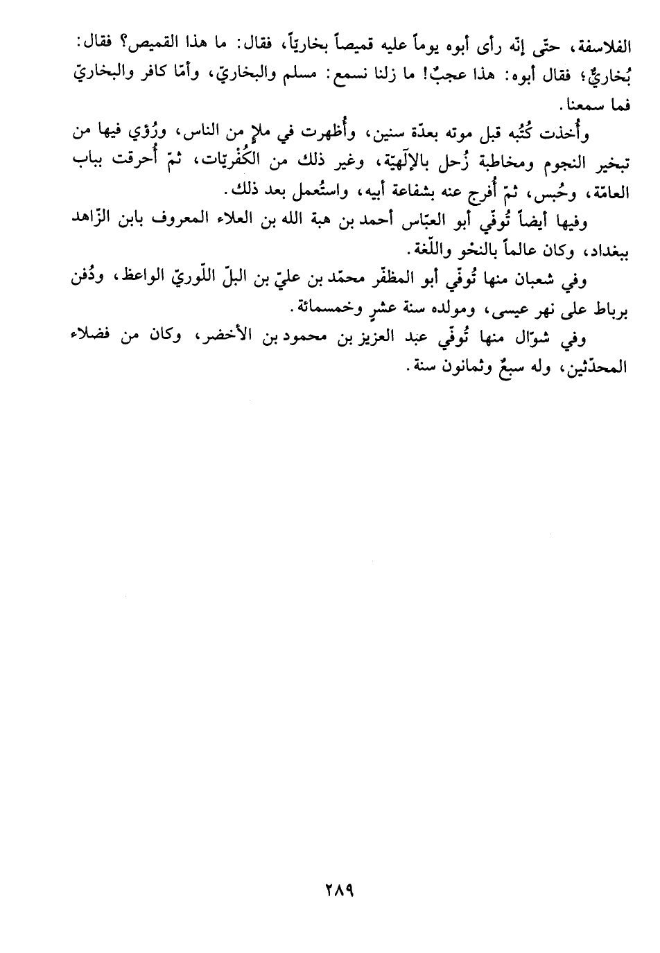 الْفَلَاسِفَةِ حَتَّى إِنَّهُ رَأَى أَبُوهُ يَوْمًا عَلَيْهِ قَمِيصًا بُخَارِيًّا، فَقَالَ: مَا هَذَا الْقَمِيصُ؟ فَقَالَ: بُخَارِيٌّ. فَقَالَ أَبُوهُ: هَذَا عَجَبٌ! مَا زِلْنَا نَسْمَعُ: مُسْلِمٌ وَالْبُخَارِيُّ، وَأَمَّا كَافِرٌ وَالْبُخَارِيُّ فَمَا سَمِعْنَا.