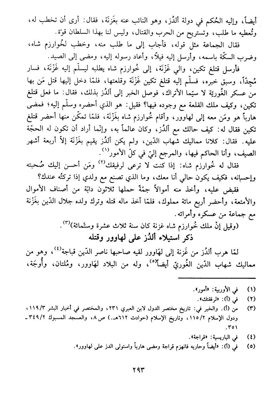 فَأَرْسَلَ قِتَلْغُ تَكِينَ وَالِيَ غَزْنَةَ، إِلَى خُوَارَزْم شَاهْ يَطْلُبُهُ لِيُسَلِّمَ إِلَيْهِ غَزْنَةَ، فَسَارَ مُجِدًّا، وَسَبَقَ خَبَرَهُ، فَسَلَّمَ إِلَيْهِ قِتَلْغُ تَكِينَ غَزْنَةَ وَقَلْعَتَهَا، فَلَمَّا دَخَلَ إِلَيْهَا قَتَلَ مَنْ بِهَا مِنْ عَسْكَرِ الْغُورِيَّةِ لَا سِيَّمَا الْأَتْرَاكُ، فَوَصَلَ الْخَبَرُ إِلَى أَلْدُزَ بِذَلِكَ، فَقَالَ: مَا فَعَلَ قِتَلْغُ تَكِينَ، وَكَيْفَ مَلَكَ الْقَلْعَةَ مَعَ وُجُودِهِ فِيهَا؟ فَقِيلَ: هُوَ الَّذِي أَحْضَرَهُ وَسَلَّمَ إِلَيْهِ، فَمَضَى هَارِبًا هُوَ وَمَنْ مَعَهُ إِلَى لَهَاوُورَ، وَأَقَامَ خُوَارَزْم شَاهْ بِغَزْنَةَ، فَلَمَّا تَمَكَّنَ مِنْهَا أَحْضَرَ قِتَلْغُ تَكِينَ فَقَالَ لَهُ: كَيْفَ حَالُكَ مَعَ أَلْدُزَ؟ وَكَانَ عَالِمًا بِهِ، وَإِنَّمَا أَرَادَ أَنْ تَكُونَ لَهُ الْحُجَّةُ عَلَيْهِ. فَقَالَ: كِلَانَا مَمَالِيكُ شِهَابِ الدِّينِ، وَلَمْ يَكُنْ أَلْدُزَ يُقِيمُ بِغَزْنَةَ إِلَّا أَرْبَعَةَ أَشْهُرِ الصَّيْفِ، وَأَنَا الْحَاكِمُ فِيهَا، وَالْمَرْجِعُ إِلَيَّ فِي كُلِّ الْأُمُورِ.