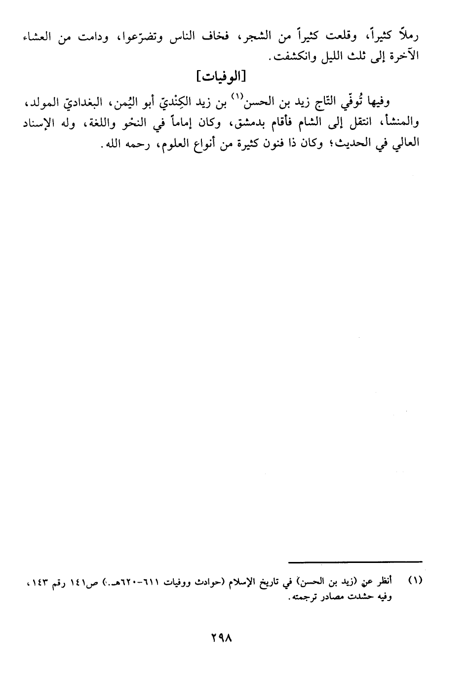وَفِيهَا تُوُفِّيَ التَّاجُ زَيْدُ بْنُ الْحَسَنِ بْنِ زَيْدٍ الْكِنْدِيُّ أَبُو الْيُمْنِ، الْبَغْدَادِيُّ الْمَوْلِدِ وَالْمَنْشَأِ، انْتَقَلَ إِلَى الشَّامِ، فَأَقَامَ بِدِمَشْقَ، وَكَانَ إِمَامًا فِي النَّحْوِ وَاللُّغَةِ، وَلَهُ الْإِسْنَادُ الْعَالِي فِي الْحَدِيثِ، وَكَانَ ذَا فُنُونٍ كَثِيرَةٍ مِنْ أَنْوَاعِ الْعُلُومِ، رَحِمَهُ اللَّهُ.