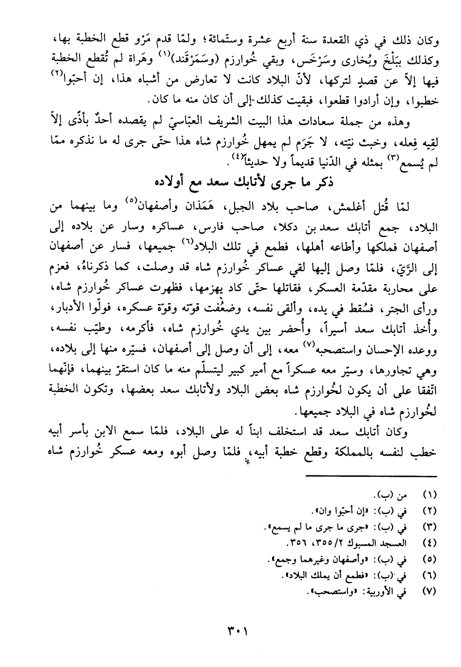 وَهَذِهِ مِنْ جُمْلَةِ سِعَادَاتِ هَذَا الْبَيْتِ الشَّرِيفِ الْعَبَّاسِيِّ لَمْ يَقْصِدْهُ أَحَدٌ بِأَذًى إِلَّا لَقِيَهُ فِعْلُهُ، وَخُبْثُ نِيَّتِهِ، لَا جَرَمَ لَمْ يُمْهِلْ خُوَارَزْم شَاهْ هَذَا حَتَّى جَرَى لَهُ مَا نَذْكُرُهُ مِمَّا لَمْ يُسْمَعْ، بِمِثْلِهِ فِي الدُّنْيَا قَدِيمًا وَلَا حَدِيثًا.