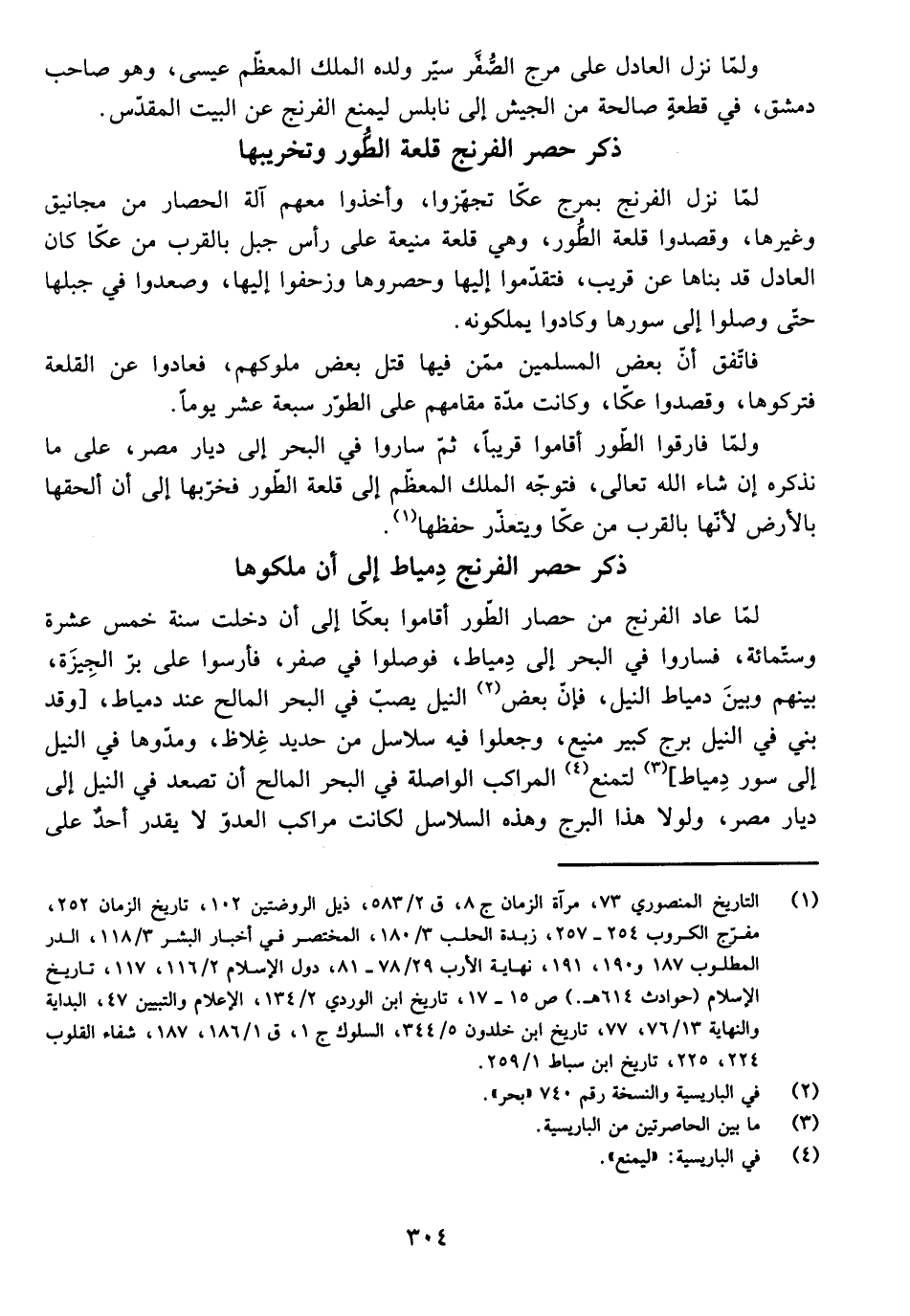 لَمَّا عَادَ الْفِرِنْجُ مِنْ حِصَارِ الطُّورِ أَقَامُوا بَعَكَّا إِلَى أَنْ دَخَلَتْ سَنَةُ خَمْسَ عَشْرَةَ وَسِتِّمِائَةٍ، فَسَارُوا فِي الْبَحْرِ إِلَى دِمْيَاطَ، فَوَصَلُوا فِي صَفَرٍ، فَأَرْسَوْا عَلَى بَرِّ الْجِيزَةِ، بَيْنَهُمْ وَبَيْنَ دِمْيَاطَ النِّيلُ، فَإِنَّ بَعْضَ النِّيلِ يَصُبُّ فِي الْبَحْرِ الْمَالِحِ عِنْدَ دِمْيَاطَ، وَقَدْ بُنِيَ فِي النَّيْلِ بُرْجٌ كَبِيرٌ مَنِيعٌ، وَجَعَلُوا فِيهِ سَلَاسِلَ مِنْ حَدِيدٍ غِلَاظٍ، وَمَدُّوهَا فِي النَّيْلِ إِلَى سُورِ دِمْيَاطَ لِتَمْنَعَ الْمَرَاكِبَ الْوَاصِلَةَ فِي الْبَحْرِ الْمَالِحِ أَنَّ تَصْعَدَ فِي النِّيلِ إِلَى دِيَارِ مِصْرَ، وَلَوْلَا هَذَا الْبُرْجُ وَهَذِهِ السَّلَاسِلُ لَكَانَتْ مَرَاكِبُ الْعَدُوِّ لَا يَقْدِرُ أَحَدٌ عَلَى