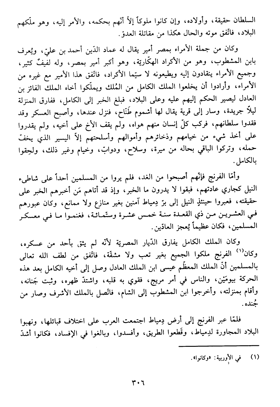 وَكَانَ الْمَلِكُ الْكَامِلُ يُفَارِقُ الدِّيَارَ الْمِصْرِيَّةَ لِأَنَّهُ لَمْ يَثِقْ بِأَحَدٍ مِنْ عَسْكَرِهِ، وَكَانَ الْفِرِنْجُ مَلَكُوا الْجَمِيعَ بِغَيْرِ تَعَبٍ وَلَا مَشَقَّةٍ، فَاتَّفَقَ مَنْ لُطْفِ اللَّهِ تَعَالَى بِالْمُسْلِمِينَ أَنَّ الْمَلِكَ الْمُعَظَّمَ عِيسَى ابْنَ الْمَلِكِ الْعَادِلِ وَصَلَ إِلَى أَخِيهِ الْكَامِلِ بَعْدَ هَذِهِ الْحَرَكَةِ بِيَوْمَيْنِ، وَالنَّاسُ فِي أَمْرٍ مَرِيجٍ، فَقَوِيَ بِهِ قَلْبُهُ وَاشْتَدَّ ظَهْرُهُ، وَثَبَتَ جَنَانُهُ، وَأَقَامَ بِمَنْزِلَتِهِ، وَأَخْرَجُوا ابْنَ الْمَشْطُوبَ إِلَى الشَّامِ، فَاتَّصَلَ بِالْمَلِكِ الْأَشْرَفِ وَصَارَ مِنْ جُنْدِهِ.