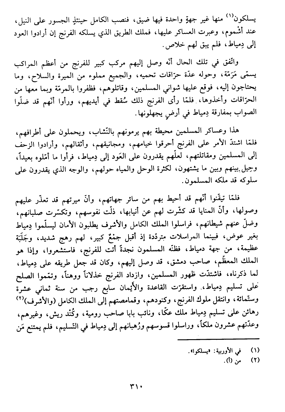 يَسْلُكُونَ مِنْهَا غَيْرَ جِهَةٍ وَاحِدَةٍ فِيهَا ضِيقٌ، فَنَصَبَ الْكَامِلُ حِينَئِذٍ الْجُسُورَ عَلَى النِّيلِ، عِنْدَ أَشْمُومَ، وَعَبَرَتِ الْعَسَاكِرُ عَلَيْهَا، فَمَلَكَ الطَّرِيقَ الَّذِي يَسْلُكُهُ الْفِرِنْجُ إِنْ أَرَادُوا الْعَوْدَ إِلَى دِمْيَاطَ، فَلَمْ يَبْقَ لَهُمْ خَلَاصٌ.