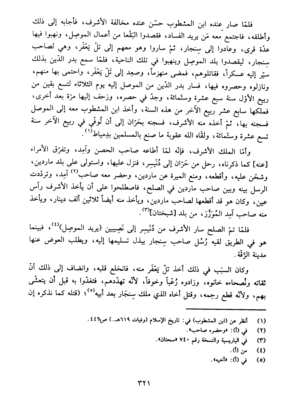 وَأَمَّا الْمَلِكُ الْأَشْرَفُ فَإِنَّهُ لَمَّا أَطَاعَهُ صَاحِبُ الْحِصْنِ وَآمِدَ. وَتَفَرَّقَ الْأُمَرَاءُ عَنْهُ كَمَا ذَكَرْنَاهُ، رَحَلَ مِنَ حَرَّانَ إِلَى دُنَيْسِرَ، فَنَزَلَ عَلَيْهَا وَاسْتَوْلَى عَلَى بَلَدِ مَارِدِينَ، وَشَحَّنَ عَلَيْهِ، وَأَقْطَعَهُ. وَمَنَعَ الْمِيرَةَ عَنْ مَارِدِينَ، وَحَضَرَ مَعَهُ صَاحِبُ آمِدَ، وَتَرَدَّدَتِ الرُّسُلُ بَيْنَهُ وَبَيْنَ صَاحِبِ مَارِدِينَ فِي الصُّلْحِ، فَاصْطَلَحُوا عَلَى أَنْ يَأْخُذَ الْأَشْرَفُ رَأْسَ عَيْنٍ، وَكَانَ هُوَ قَدْ أَقْطَعَهَا لِصَاحِبِ مَارِدِينَ، وَيَأْخُذَ مِنْهُ أَيْضًا أَلْفَ دِينَارٍ، وَيَأْخُذَ مِنْهُ صَاحِبُ آمِدَ الْمُوَزَّرَ، مِنْ بَلَدِ شَبَخْتَانَ.