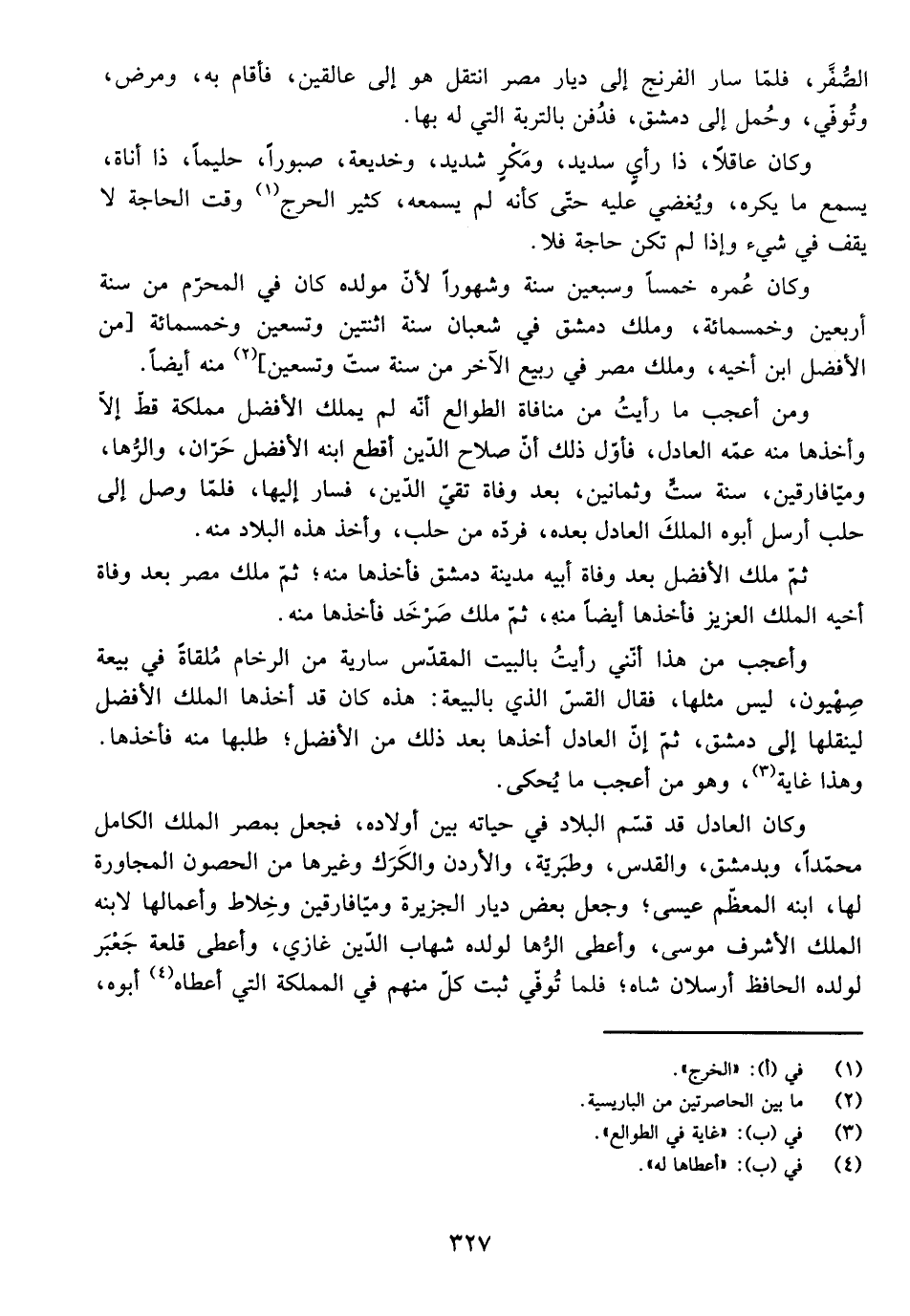 وَمِنْ أَعْجَبِ مَا رَأَيْتُ مِنْ مُنَافَاةِ الطَّوَالِعِ أَنَّهُ لَمْ يَمْلِكِ الْأَفْضَلُ مَمْلَكَةً قَطُّ إِلَّا وَأَخَذَهَا مِنْهُ عَمُّهُ الْعَادِلُ، فَأَوَّلُ ذَلِكَ أَنَّ صَلَاحَ الدِّينِ أَقْطَعَ ابْنَهُ الْأَفْضَلَ حَرَّانَ، وَالرُّهَا، وَمَيَّافَارِقِينَ سَنَةَ سِتٍّ وَثَمَانِينَ، بَعْدَ وَفَاةِ تَقِيِّ الدِّينِ، فَسَارَ إِلَيْهَا، فَلَمَّا وَصَلَ إِلَى حَلَبَ أَرْسَلَ أَبُوهُ الْمَلِكَ الْعَادِلَ بَعْدَهُ، فَرَدَّهُ مِنْ حَلَبَ، وَأَخَذَ هَذِهِ الْبِلَادَ مِنْهُ.
