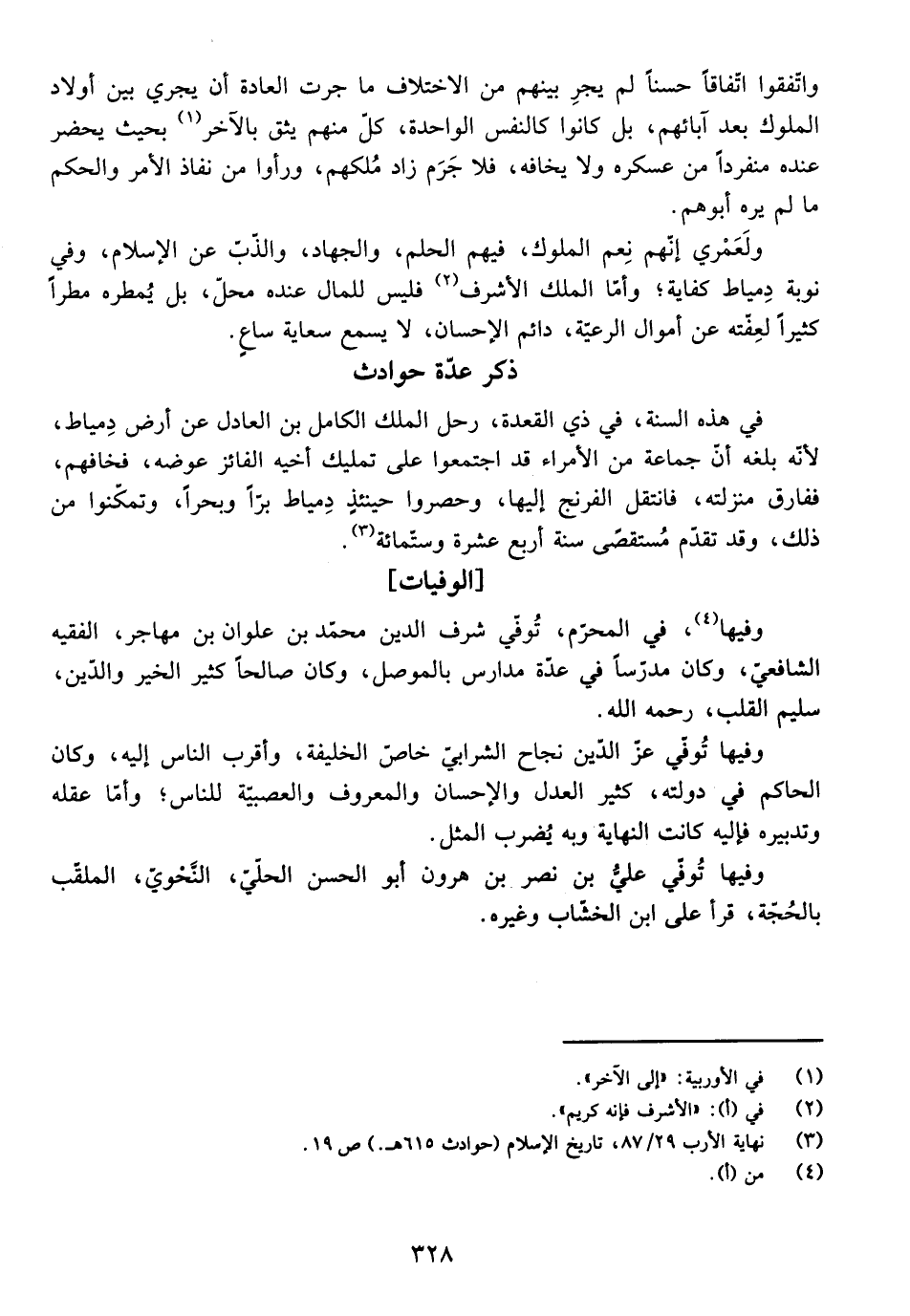 وَلَعَمْرِي إِنَّهُمْ نِعْمَ الْمُلُوكُ، فِيهِمُ الْحِلْمُ، وَالْجِهَادُ، وَالذَّبُّ عَنِ الْإِسْلَامِ، وَفِي نَوْبَةِ دِمْيَاطَ كِفَايَةٌ، وَأَمَّا الْمَلِكُ الْأَشْرَفُ فَلَيْسَ لِلْمَالِ عِنْدَهُ مَحَلٌّ، بَلْ يُمْطِرُهُ مَطَرًا كَثِيرًا لِعِفَّتِهِ عَنْ أَمْوَالِ الرَّعِيَّةِ، دَائِمُ الْإِحْسَانِ، لَا يَسْمَعُ سِعَايَةَ سَاعٍ.