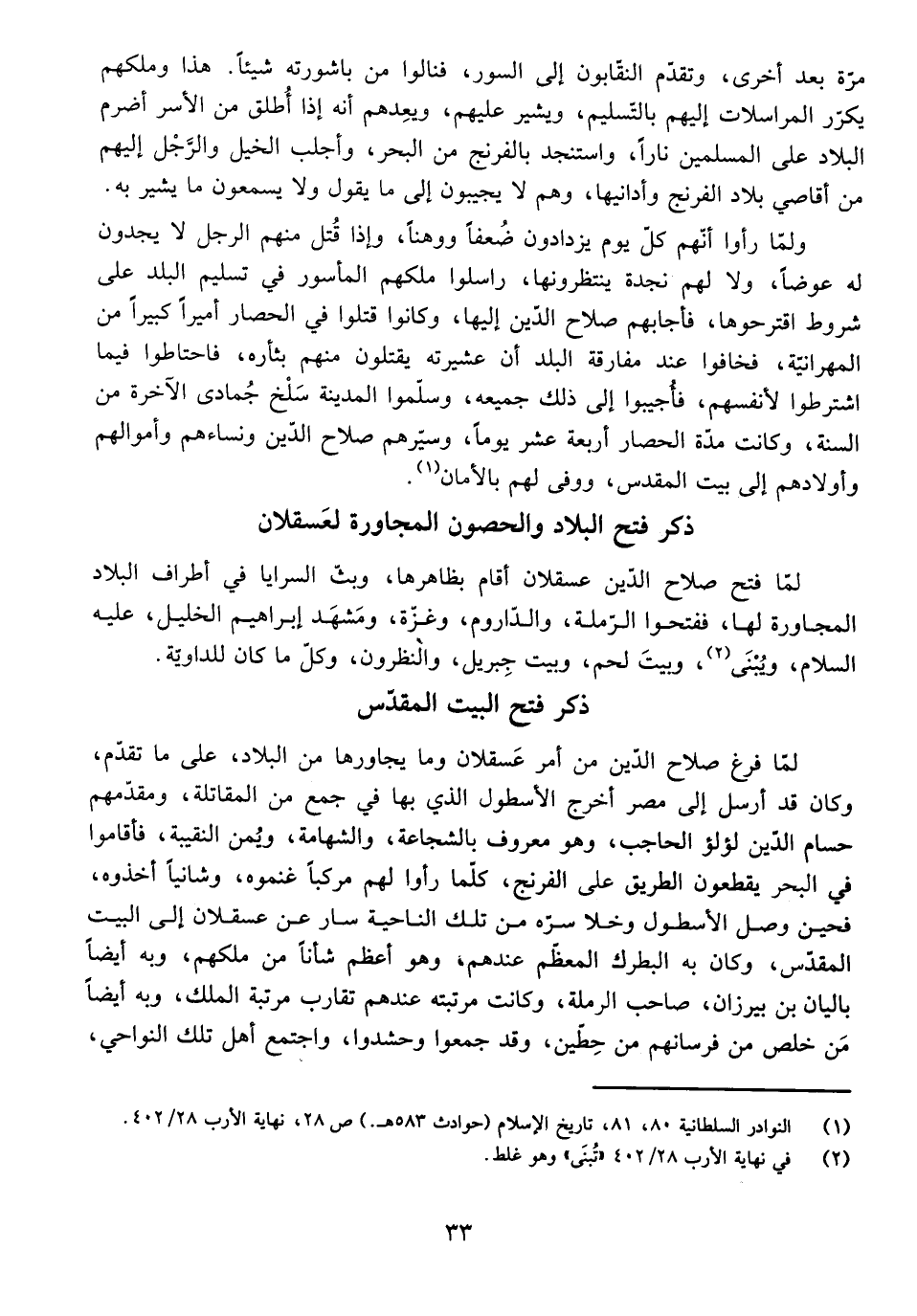 مَرَّةً بَعْدَ أُخْرَى، وَتَقَدَّمَ النَّقَّابُونَ إِلَى السُّورِ، فَنَالُوا مِنْ بَاشُورَتِهِ شَيْئًا. هَذَا وَمَلِكُهُمْ يُكَرِّرُ الْمُرَاسَلَاتِ إِلَيْهِمْ بِالتَّسْلِيمِ، وَيُشِيرُ عَلَيْهِمْ، وَيَعِدُهُمْ أَنَّهُ إِذَا أُطْلِقَ مِنَ الْأَسْرِ أَضْرَمَ الْبِلَادَ عَلَى الْمُسْلِمِينَ نَارًا، وَاسْتَنْجَدَ بِالْفِرِنْجِ مِنَ الْبَحْرِ، وَأَجْلَبَ الْخَيْلَ وَالرَّجْلَ إِلَيْهِمْ مِنْ أَقَاصِي بِلَادِ الْفِرِنْجِ وَأَدَانِيهَا، وَهُمْ لَا يُجِيبُونَ إِلَى مَا يَقُولُ وَلَا يَسْمَعُونَ مَا يُشِيرُ بِهِ.