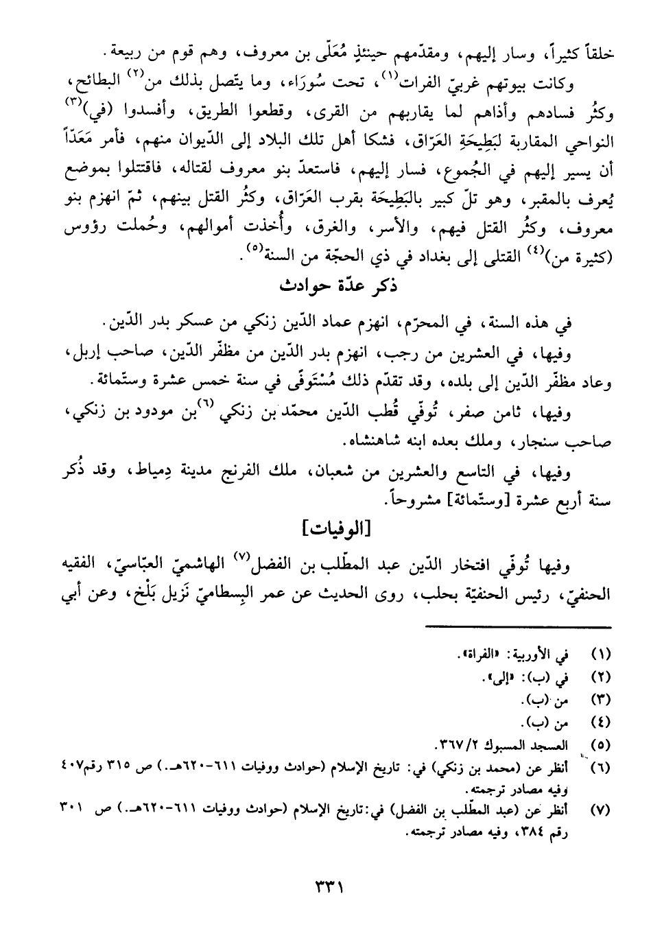 وَفِيهَا تُوُفِّيَ افْتِخَارُ الدِّينِ عَبْدُ الْمُطَّلَبِ بْنُ الْفَضْلِ الْهَاشِمِيُّ الْعَبَّاسِيُّ، الْفَقِيهُ الْحَنَفِيُّ، رَئِيسُ الْحَنَفِيَّةِ بِحَلَبَ، رَوَى الْحَدِيثَ عَنْ عُمَرَ الْبِسْطَامِيِّ نَزِيلِ بَلْخَ، وَعَنْ أَبِي