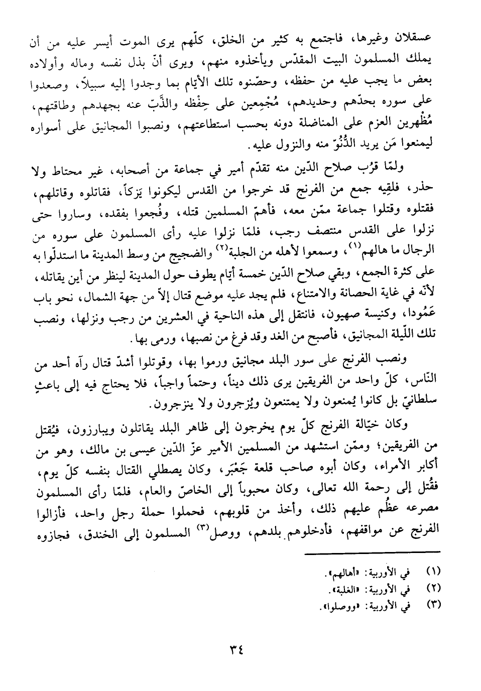 وَنَصَبَ الْفِرِنْجُ عَلَى سُورِ الْبَلَدِ مَجَانِيقَ وَرَمَوْا بِهَا، وَقُوتِلُوا أَشَدَّ قِتَالٍ رَآهُ أَحَدٌ مِنَ النَّاسِ، كُلُّ وَاحِدٍ مِنَ الْفَرِيقَيْنِ يَرَى ذَلِكَ دِينًا، وَحَتْمًا وَاجِبًا، فَلَا يَحْتَاجُ فِيهِ إِلَى بَاعِثٍ سُلْطَانِيٍّ بَلْ كَانُوا يَمْنَعُونَ وَلَا يَمْتَنِعُونَ وَيَزْجُرُونَ وَلَا يَنْزَجِرُونَ.