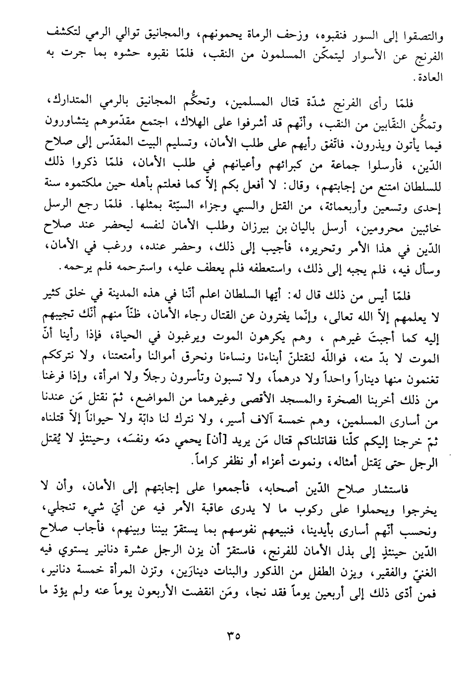 فَاسْتَشَارَ صَلَاحُ الدِّينِ أَصْحَابَهُ. فَأَجْمَعُوا عَلَى إِجَابَتِهِمْ إِلَى الْأَمَانِ، وَأَنْ لَا يَخْرُجُوا وَيَحْمِلُوا عَلَى رُكُوبِ مَا لَا يُدْرَى عَاقِبَةُ الْأَمْرِ فِيهِ عَنْ أَيِّ شَيْءٍ تَنْجَلِي، وَنَحْسَبُ أَنَّهُمْ أُسَارَى بِأَيْدِينَا، فَنَبِيعُهُمْ نُفُوسَهُمْ بِمَا يَسْتَقِرُّ بَيْنَنَا وَبَيْنَهُمْ، فَأَجَابَ صَلَاحُ الدِّينِ حِينَئِذٍ إِلَى بَذْلِ الْأَمَانِ لِلْفِرِنْجِ.